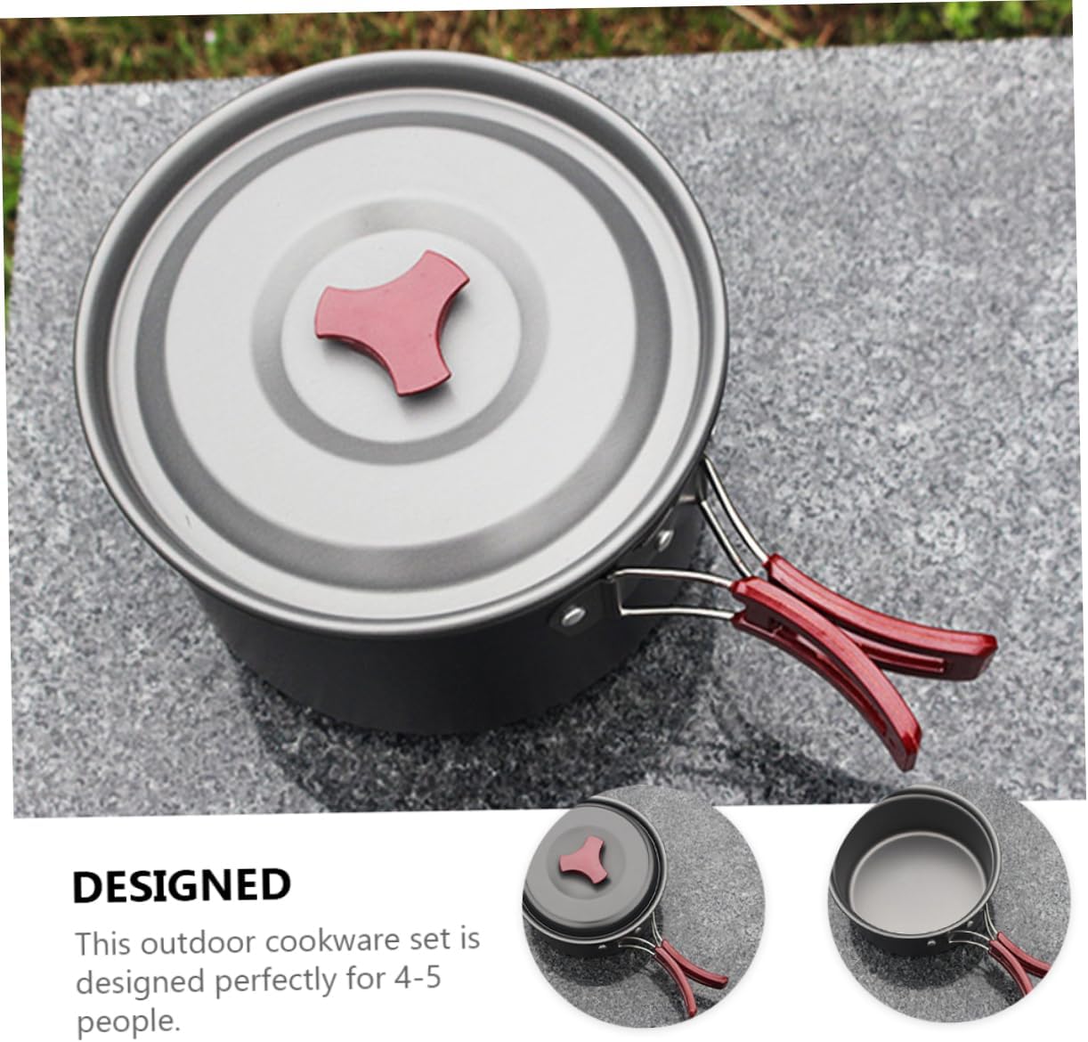 Package Include 1 x Frying Pan 1 x Big Pot 1 x Medium Pot 1 x Small Pot 1 x Soup Spoon 1 x Rice Scoop 5 x Plastic Bowls 2 x Plastic Plates 1 x Cleaning Sponge Characteristics - Small Pot Size: Approx. 13.5 x 7.1 cm / 5.31 x 2.79 inch; 1.02L (capacity) Portable Cooking Equipment. - Big Pot Size: Approx. 18.1 cm / 7.12 x 4.33 inch; 2.83L (capacity) Camping Cookware. - Frying Pan Size: Approx. 18.6 x 5.2 cm / 7.32 x 2.04 inch; 1.4L (capacity) Folding Pot. - Color: Assorted Color Outdoor Kit. - Material: Oxidized aluminum alloy Folding Cooking Pots. - Medium Pot Size: Approx. 16.2 x 8.9 cm / 6.37 x 3.5 inch; 1.83L (capacity) Cookware Kit. - The plastic handle and lid handle can prevent your hands from being burned and scalded Backpacking Cookware Kit. - This outdoor cookware set is designed for 4-5 people Kit. - Folding and compact, easy to carry out, suitable for camping, backpacking, hiking, picnic and outdoor activities Outdoor Cooking Set. - Food-grade and , safer and more assured Camping Accessories. - The can be used for frying, stewing, boiling, etc Cooking Equipment.Goods DescriptionCookware Kit This set has been carefully designed to make your camping cooking experience more fun and convenient.Outdoor Kit You deserve to have one set.Folding Pot If you are looking for a cookware set for outdoor camping, then you must not miss our portable cookware set