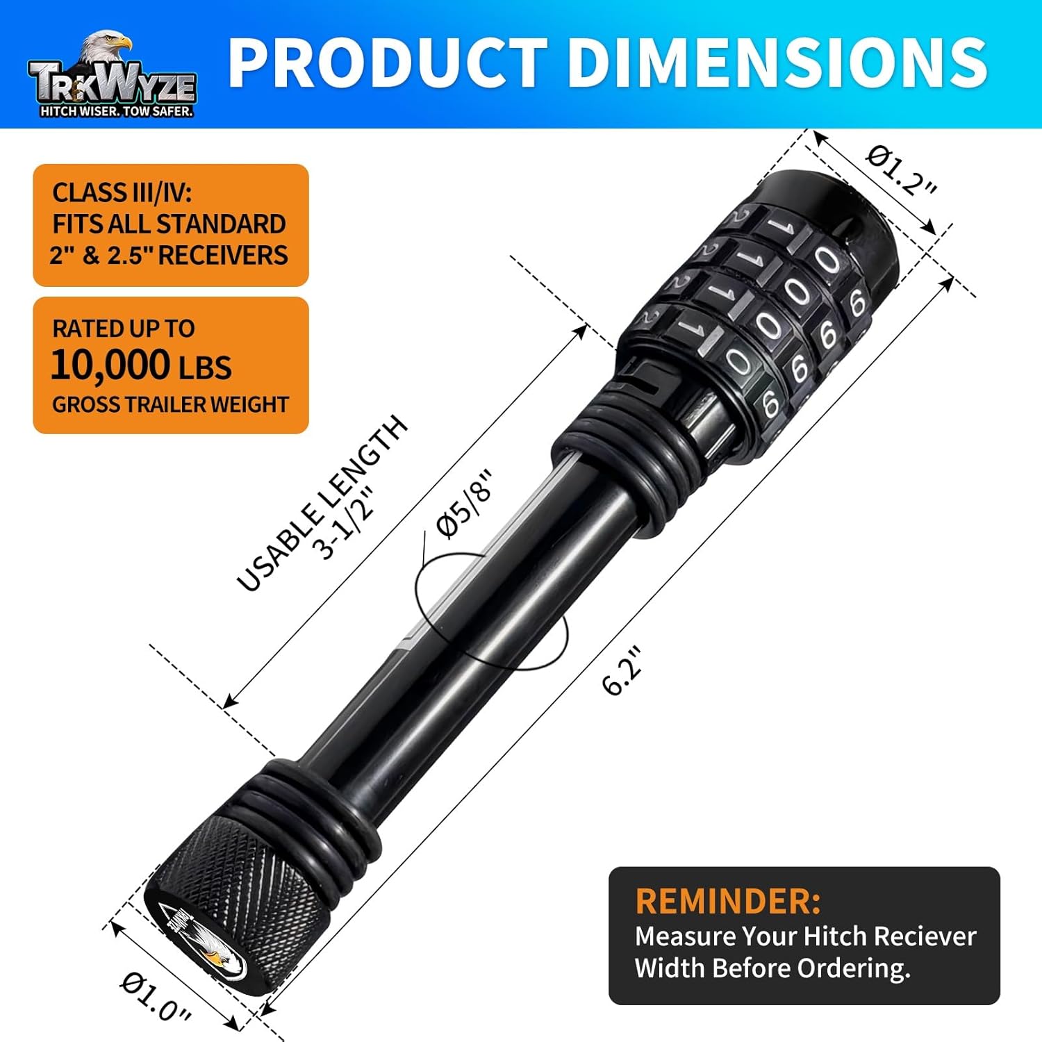Upgrade your towing setup with the TrkWyze Keyless Combination Trailer Hitch Pin Lock—built for drivers who demand security without the hassle of keys. No more digging through your pockets or worrying about lost keys at the worst possible moment. With a fully resettable combination, you stay in control—fast, simple, and reliable every time you hitch up. Engineered for strength, the solid steel pin and tamper-resistant locking mechanism help protect your ball mount, bike rack, or cargo carrier from theft. Whether you’re parked at a job site, trailhead, or highway stop, TrkWyze keeps your gear secure. Designed to fit most Class III–V 2”, 2.5” receivers, this lock delivers a snug, rattle-free hold that stays tight mile after mile. The weather-resistant coating and sealed lock core are built to handle rain, mud, snow, and extreme temperatures—so you’re ready for any road, any season. From daily commutes to cross-country hauls, TrkWyze combines keyless convenience, rugged durability, and trusted protection—all in one essential towing upgrade. Hitch wiser. Tow safer. Choose TrkWyze.