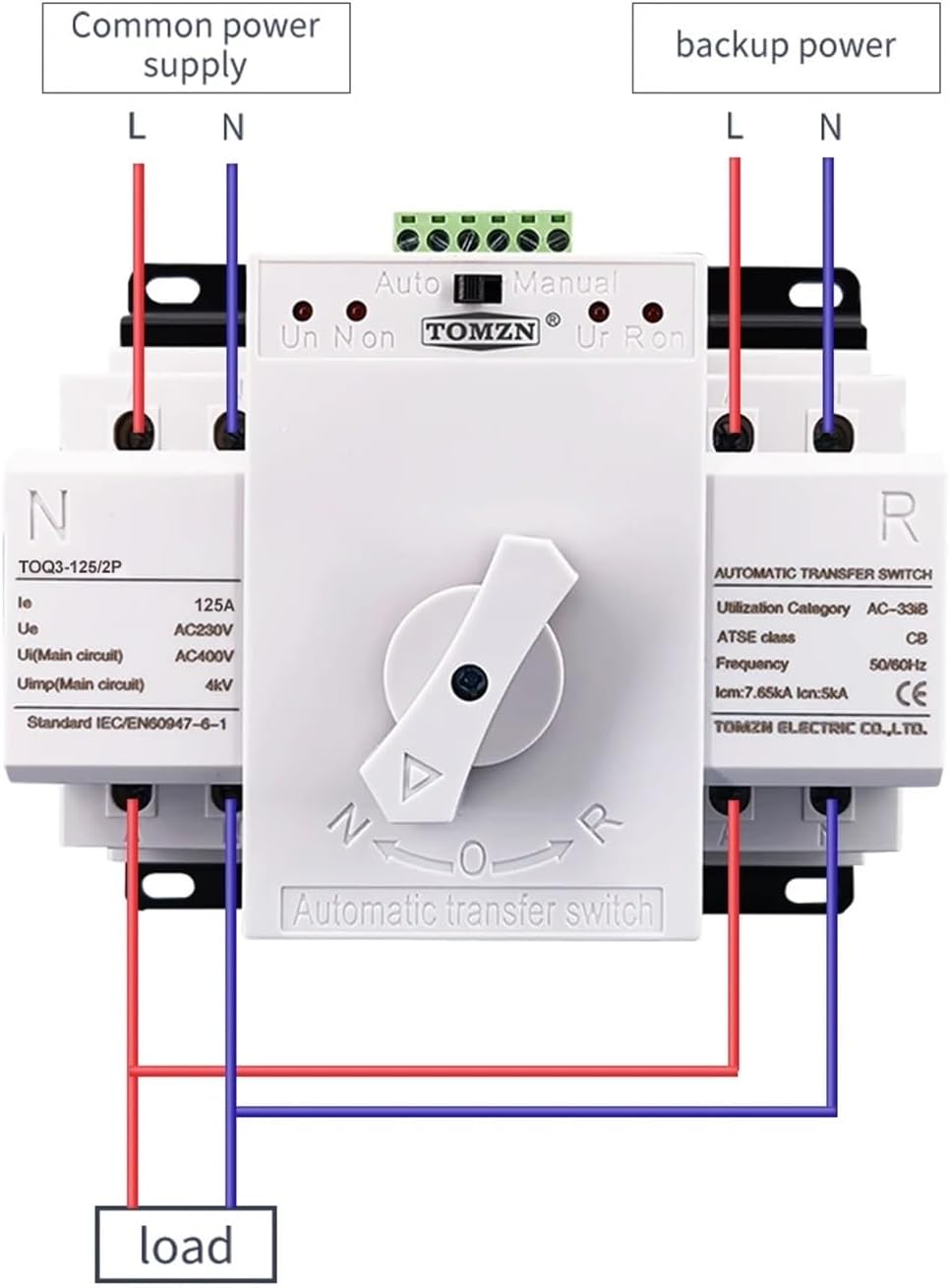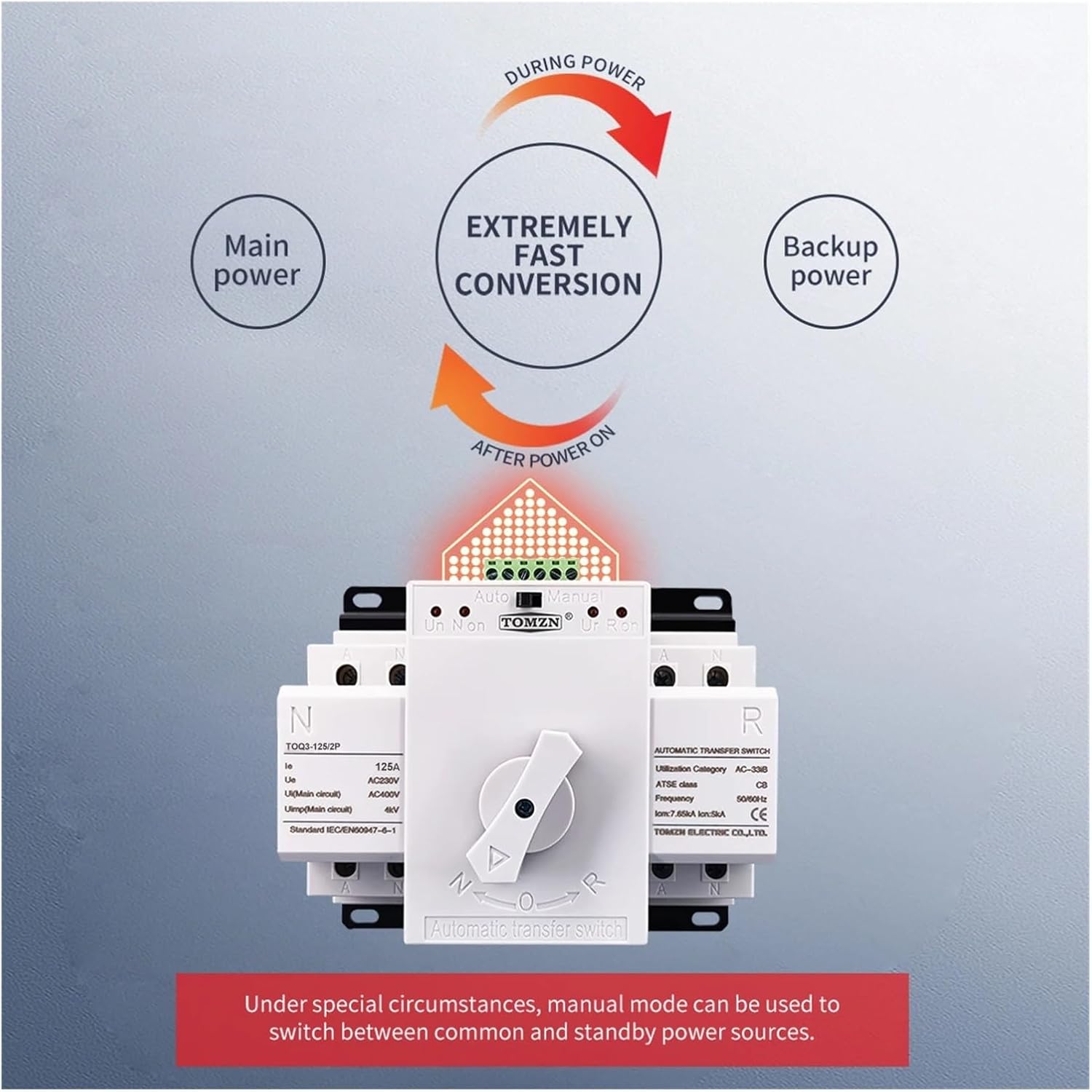 switchSwitchesRated: voltage 220V 50/60HZNoted: power will be interrupted when Switching.<;;4sThe 125A ATS don't have over current and short current protection.Max current: 125A