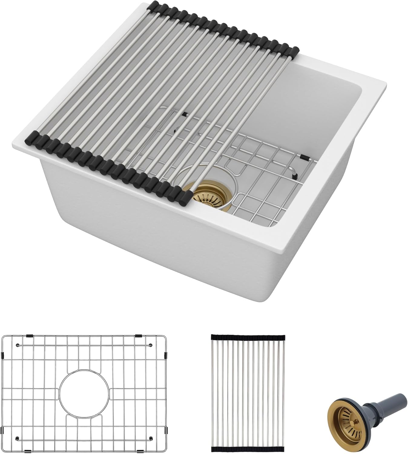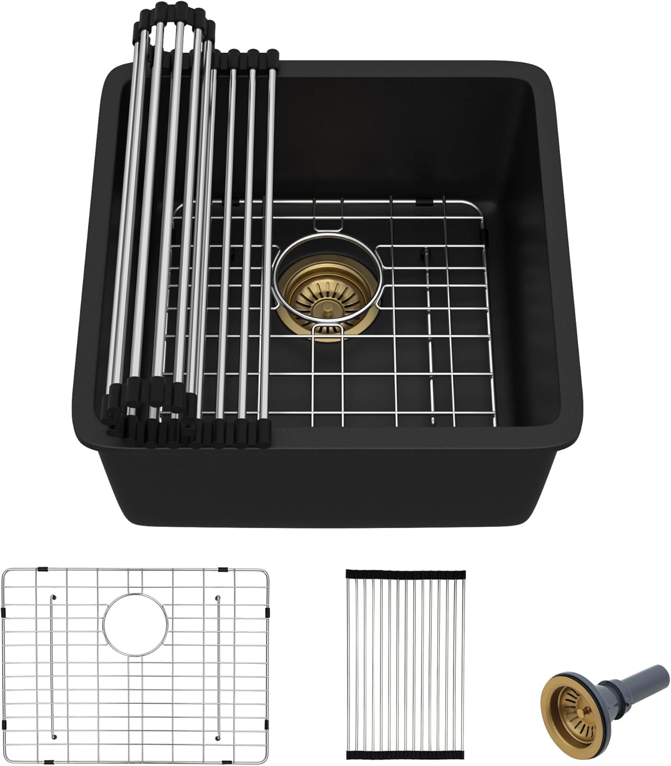 | Included Components | 33 inch undermount granite composite kitchen sink, bottom rinse grid, drain assembly with cover, roll up drying rack |