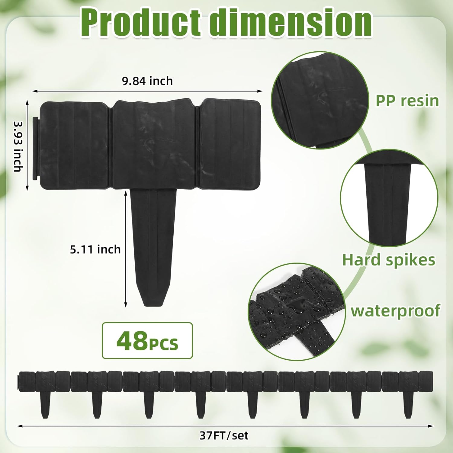 Features: Achieve the garden of your dreams without breaking the bank. This landscape edging provides an ideal option for creating beautiful, well defined garden spaces The sturdy structure of the plastic fencing lawn border effectively withstands external impacts, maintaining its shape for a long time without frequent maintenance. Specifications: Material: PP, resin Color: black Size: panel measures is about 9.84 x 3.93 inches/ 25 x 10 cm and embedding section is about 5.11 inches/ 13 cm Package includes: 48 x Landscape edging border Notes: Manual measurement, please allow slight errors on size. The color may exist a slight difference due to different screen displays