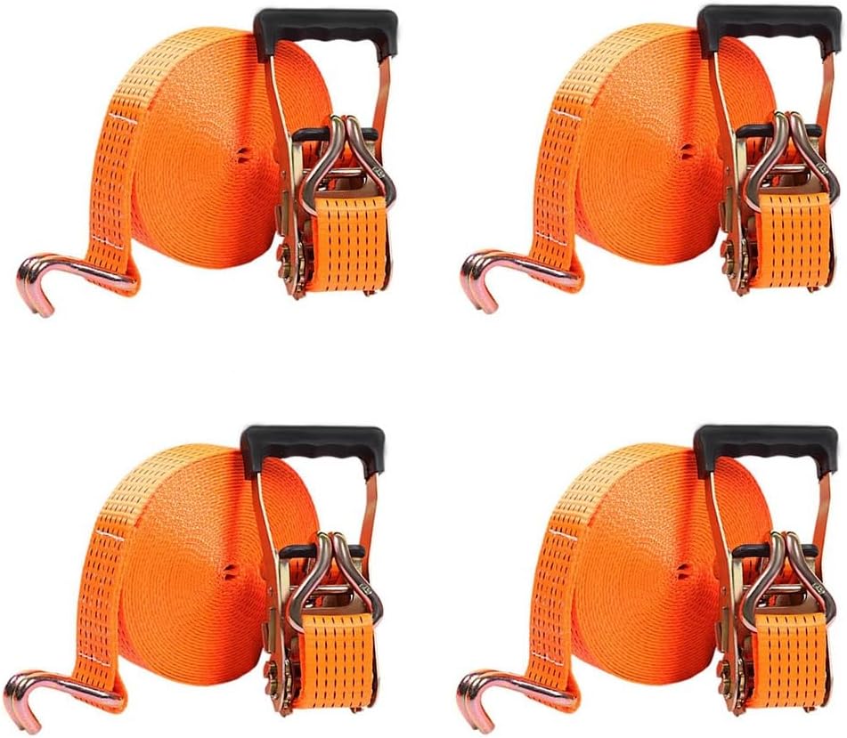 Equipped with strong double J-hooks, these ratchet straps can withstand high-tensile forces. Easy to load and unload, they grip tightly to your cargo, ensuring secure transport and avoiding any shifting during transit. Sturdy and tough, these straps handle a wide range of heavy-duty bundling needs effortlessly.How to Tighten Strap:1. Pass the strap under the tensioner rotating shaft2. Pass the strap through the center slot of the tensioner rotating shaft3. Pull the tensioner handle back and forthHow to Release Strap:1. Fasten the safety plate outwards2. Open the tensioner to level3. Pull out the strapSpecification:Material: Metal, PolyesterRatchet Strap Width: 4cm/1.57in,5cm/1.96inRatchet Strap Length: 2m/78.7in , 3m/118in , 4m/157in , 5m/196in , 6m/236in , 7m/275in , 8m/314in , 9m/354in , 10m/393inWorking Load: 11023 lbs / 5 tonsBreak Strength: 6613 lbsColor: OrangePackage Included:4x Straps Heavy Duty with Hooks