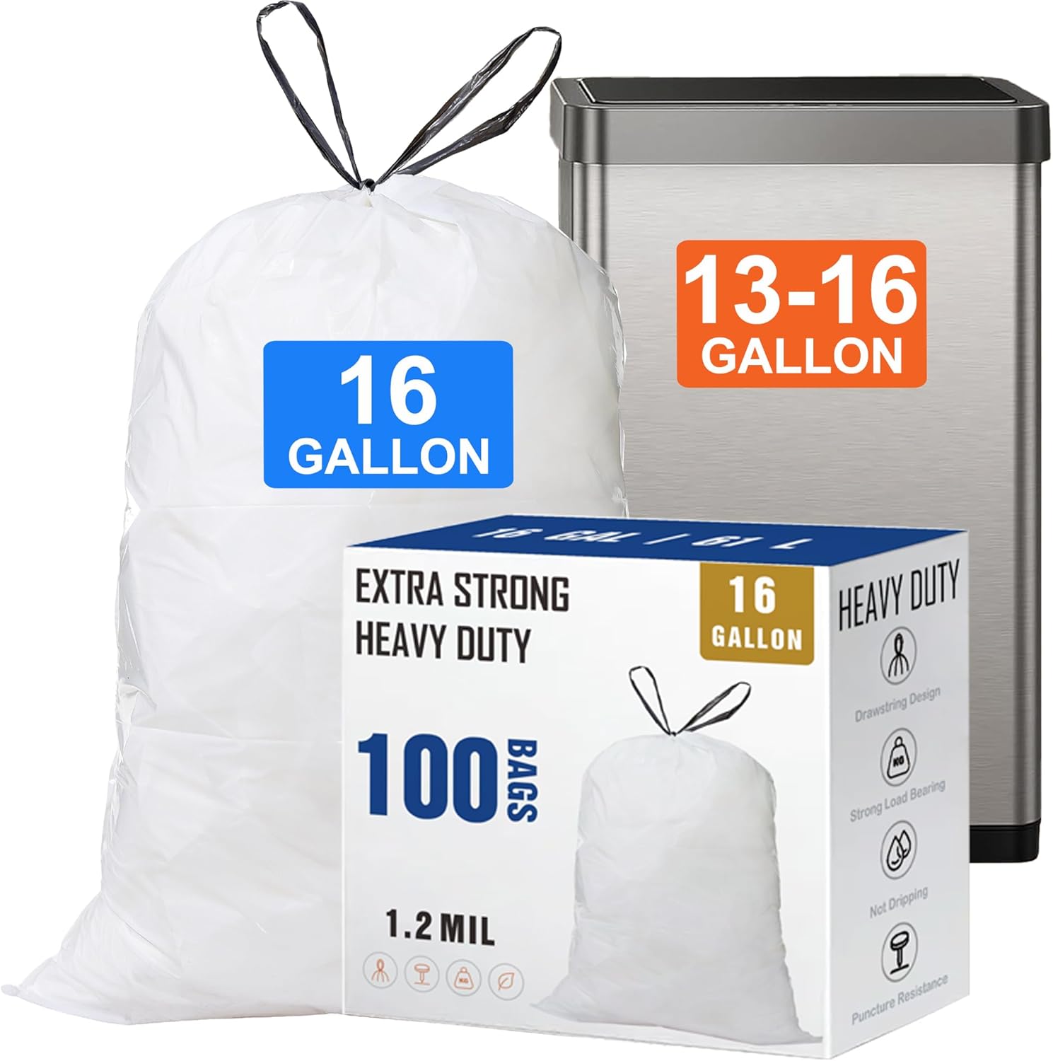 5 Gallon Drawstring Trash Bags (200 Count) 1.2 Mils Heavy Duty Garbage Bags Compatible with 5Gallon Bucket & Mesh Trash Can & Fit All 5 Gallon Trash Can for Home Office Kitchen Bathroom Bedroom Advantage of Our 5 Gallon Heavy Duty Trash Bags: - Extra Strong : 1.2 mil thick. Made of newest pure HDPE material, a thicker and more durable material is resistant to tearing. Over 2x thicker than standard bags. Our extra strong trash bags are crafted from strong enough to carry both indoor and outdoor trash without leaking or tearing. - Reliable Drawstring Handles : Reliable handles easily help lift, tie & carry trash bags without a tear. Quick-dispense pack lets you grab liners one by one without the hassle of hard-to-find perforations or messy unraveling. - Sturdy and Tear Resistant : NO RIPS, NO TEARS. Makes a great alternative and equivalent replacement trash bags. These garbage bags can take on all your everyday household waste without ripping, tearing, or leaking. - Multipurpose : Includes 200 counts small garbage bags that fit 2-5 gallon waste baskets. 8 Rolls in total, each 25 pcs. You can distribute the rolls between several rooms to always have some on hand when taking out trash. - Came in Multi Rolls : This plastic trash bags not only used for kitchen trash can, but also for office, bedroom, living room, bath room and car. Also store other books, clothing items, organizers of holiday decorations. -Package List: 200 PCS Trash Bags
