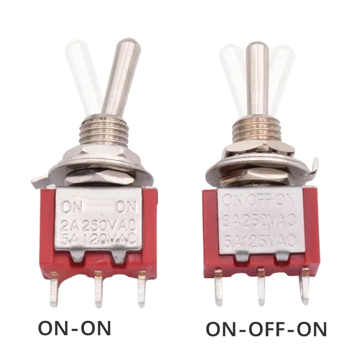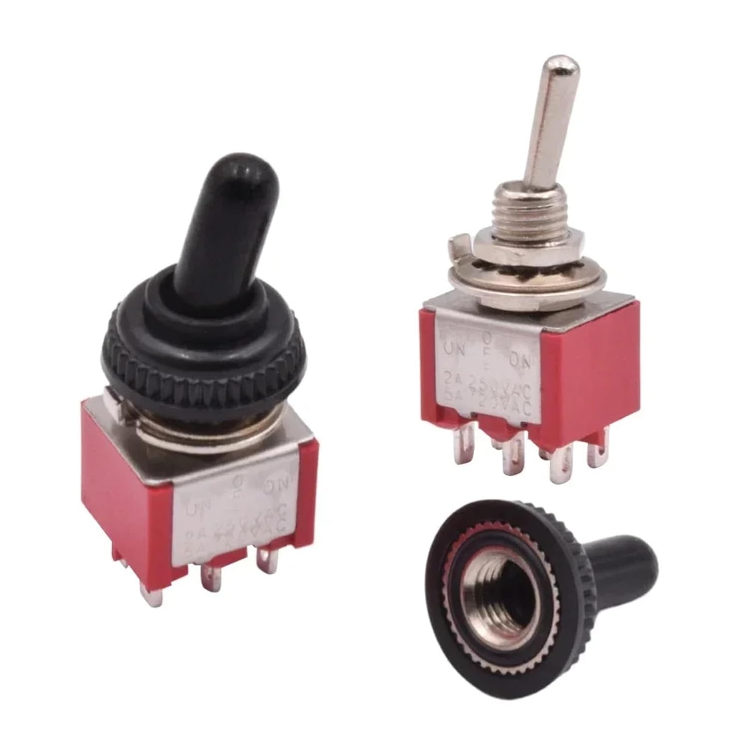 Toggle SwitchesMaterial : PlasticSwitch Type : Toggle SwitchModel Number : YD-TFeatures : with waterproof capItem Type : SWITCHESMounting hole diameter : 6mmRating : 6A 125VACCircuit Way : ON-ON / ON-OFF-ONSwitch Function : LatchingSwitch Combination : 1 way/ 2 ways/ 3 ways/ 4 ways