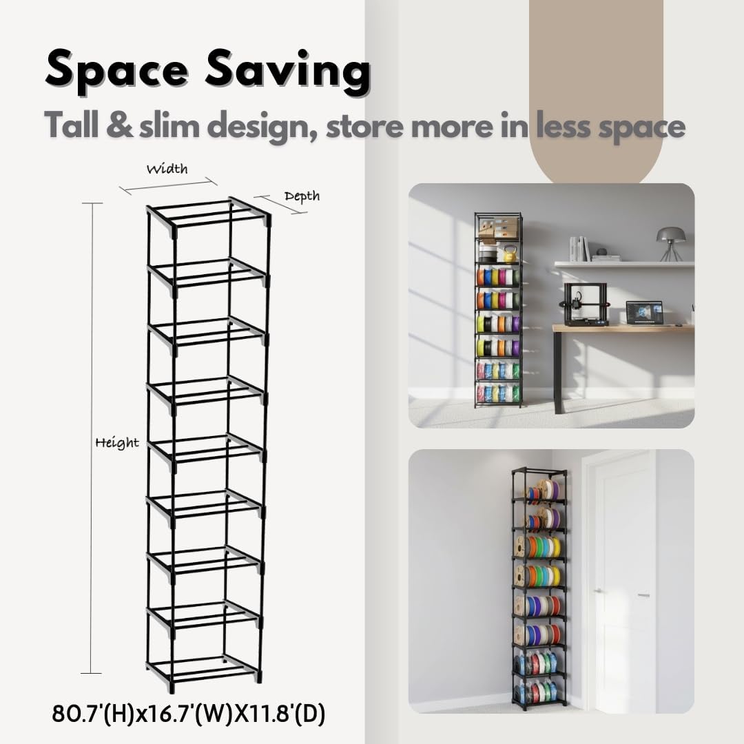 The Razzi Fidel 3D Printer Filament Storage Rack offers an efficient, flexible, and durable solution designed for 3D printing studios, offices, and workshops. It features an adjustable 9-tier design, allowing you to customize the number of tiers and height according to your storage needs, making it ideal for various workspace sizes. When fully assembled, the rack can hold up to 54 x 1kg filament spools, making it perfect for high-capacity storage. Easy to Assemble This filament storage rack is designed with user convenience in mind. Even if you have no prior experience, you can quickly and easily assemble it with the included instruction manual. No tools are required, ensuring a hassle-free assembly process. Supports Multiple Filament Sizes Each tier features two different spacing options to accommodate a variety of filament sizes, including 300g, 500g, and 1kg filament spools. This feature ensures that your filaments are securely stored, preventing tangling and keeping your materials organized. Durable and Practical Each tier is rated to hold up to 30lbs, making the rack extremely durable and stable. Built from high-quality metal pipes and PP materials, the rack is resistant to corrosion and wear, ensuring long-lasting use without bending or losing structural integrity. Versatile and Efficient The Razzi Fidel 3D Printer Filament Storage Rack is designed to accommodate a variety of 3D printing filaments, including ABS, PLA, TPU, PETG, Nylon, and more. It helps you organize your filament spools efficiently, ensuring easy access to the materials you need and minimizing waste during your 3D printing projects. Whether you are a hobbyist or a professional, the Razzi Fidel storage rack is a must-have tool for your 3D printing workspace. It will keep your work area tidy, improve your efficiency, and make your 3D printing process more organized and streamlined.