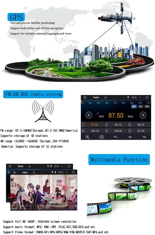 Note: We suggest specialized person to install the car stereo; please contact us if you need the installation instruction.#System Information# * OS: Android 7.1 * RAM: 2GB * ROM: 16GB * Audio Output: 4*45W max * Screen Resolution: 1024*600 #Steering Wheel Control# * You can control the volume of the car stereo and use more hot keys directly on the steering wheel. #Bluetooth 4.0# * Built-in microphone in the control panel supports hands-free calling. * Supports Bluetooth connection with iPhone and Android mobile devices. * Supports hands-free Bluetooth music/A2DP Bluetooth music. #Mirror-link/ Easy-connect/ Air-play# * For Android mobile phones, it can be mirrorred and controlled directly on the unit via USB cable connectionl; * For iPhone, it cab only be mirrorred on the unit via WiFi connection. #WiFi/ Data Network# * WiFi: Supports connecting the WiFi shared by mobile phone. * 3G: Supports WCDMA/CDMA2000/TD-SCDMA (External USB 3G modem and your local internet SIM card are required). #GPS Navigation# * Supports online and offline maps, such as Google, Navitel, lgo, TomTom, Sygic Waze and ect. * Driver can use navigation fuction while listing to music or radio at the same time. #Radio# * FM Frequency Range: 87.5-108MHz. Increment:0.05MHz(EU)/0.1MHz(US). Supports storage of 18 stations. * AM Frequency Range: 522-1620KHz. Increment: 9KHz(EU)/10KHz(US). Supports storage of 12 stations. * RDS: Yes. #Multimedia# * Music Formats: MP3,WMA; AAC,VQF,AMR,APE and ect. * Video Formats: MPEG, MP4, AVI, ASF, DAT, VOB, OGM, RMVB, MKV and etc. SupportS full HD 1080P video. #Other Special Features# * Torque Pro (OBD2&Car) * DVR and
