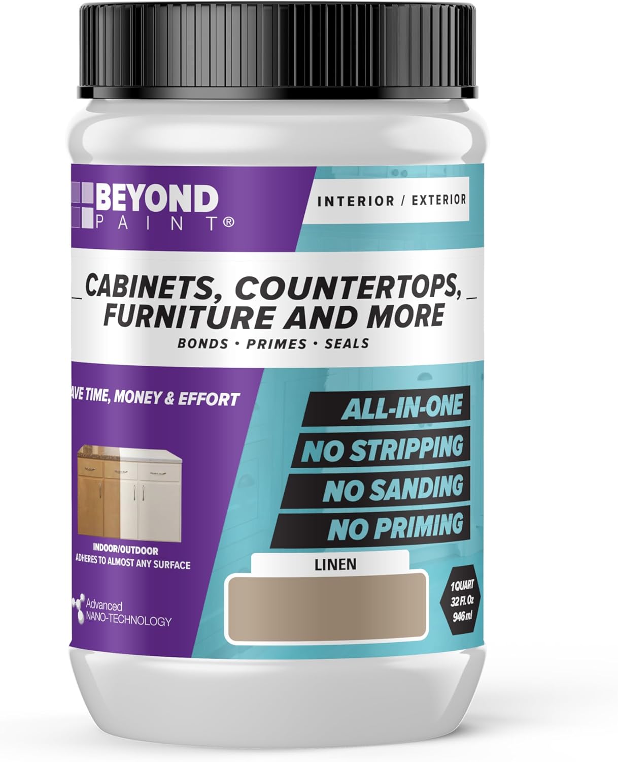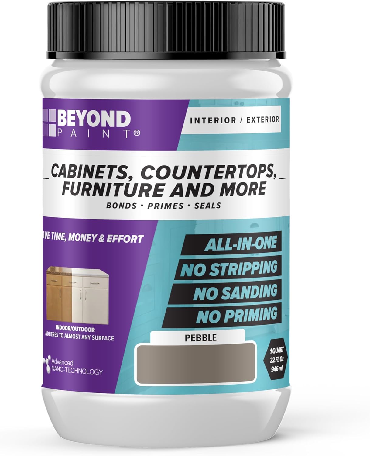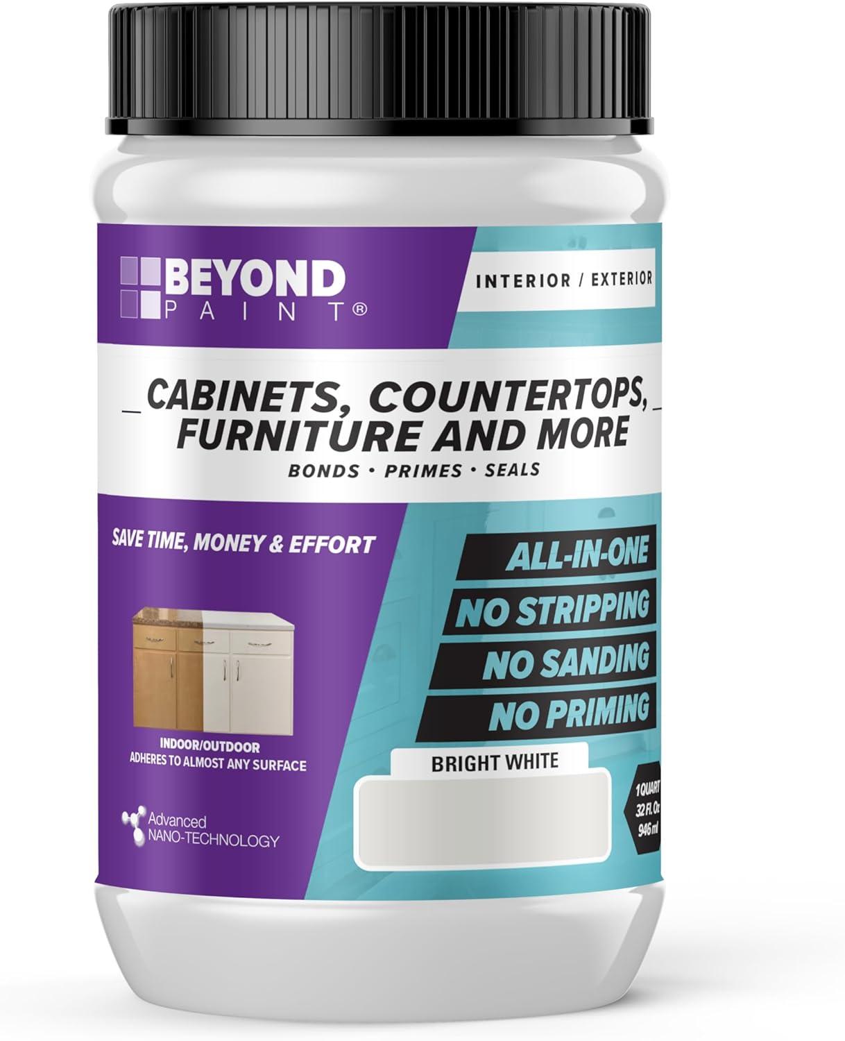 Tackle your painting project with Beyond Paint’s all-in-one bonder/primer/finisher paint. Made for refinishing furniture, cabinets, countertops and more; it delivers fast-drying time and a smooth, flawless finish. Get professional results in 1-2 coats without stripping, sanding or priming and without costly, timely prep work.TIPS:Minimal preparation is needed, just clean the surface of dirt, dust or oils with a general degreaser to start.A microfiber roller is recommended for optimal results. Only use brushes for creviced areas, then roll after brushing.Two coats recommended; apply lighter coats for a less textured finish.For projects that require added durability such as countertops, flooring, outdoor projects, use Beyond Paint’s Multi-Purpose Sealer.Easy soap and water clean-up. Tape off any areas you don’t want painted. Wipe-up any undesired paint immediately.With Nano-Technology, Beyond Paint delivers 4x the paint particles providing more pigment, better coverage and extra durability. Makeover a kitchen including 10-12 cabinet doors and facings with just one quart of Beyond Paint in just one day!The low VOC, low odor formula is safe for people and pets. Perfect for indoor/outdoor use, it won’t fade in the sun. No ventilation required unless spraying.Transform the look of anything with Beyond Paint, the perfect solution for experts and DIYers alike.
