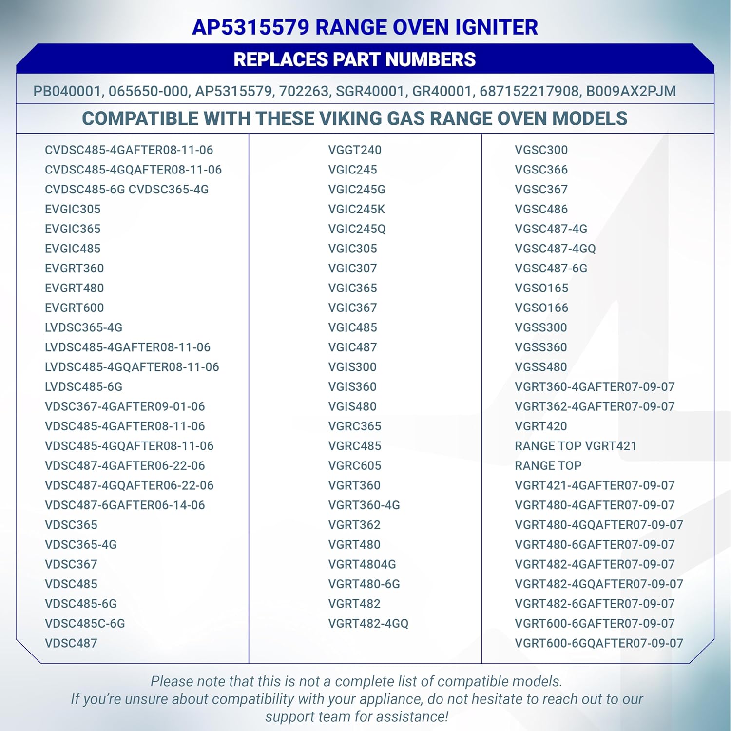 PRODUCT SPECIFICATIONS Package includes: 2 x AP5315579 Igniters with silicon carbide tips and wire connector plugs; 4 x Ceramic Nuts Length “A”: 4.5 inches Lead Length: 11.8 inches Plug Length: 0.9 inch Electrical rating: 3.3 to 3.6 Amps at 120V AC Heat up Time: 1796°F ≤ 17s Maximum Temperature: 3100°F REPLACES PART NUMBERS: PB040001, 065650-000, AP5315579, 702263, SGR40001, GR40001, 687152217908, B009AX2PJM, etc. COMPATIBLE MODELS: The AP5315579 Gas Oven Igniter fits most Viking gas range oven models. - CVDSC series: CVDSC485-4GAFTER08-11-06, CVDSC485-4GQAFTER08-11-06, CVDSC485-6G, CVDSC365-4G - EVGI series: EVGIC305, EVGIC365, EVGIC485, EVGRT360, EVGRT480, EVGRT600 - LVDSC series: LVDSC365-4G, LVDSC485-4GAFTER08-11-06, LVDSC485-4GQAFTER08-11-06, LVDSC485-6G - VDSC series: VDSC367-4GAFTER09-01-06, VDSC485-4GAFTER08-11-06, VDSC485-4GQAFTER08-11-06, VDSC487-4GAFTER06-22-06, VDSC487-4GQAFTER06-22-06, VDSC487-6GAFTER06-14-06, VDSC365, VDSC365-4G, VDSC367, VDSC485, VDSC485-6G, VDSC485C-6G, VDSC487 - VG series: VGGT240, VGIC245, VGIC245G, VGIC245K, VGIC245Q, VGIC305, VGIC307, VGIC365, VGIC367, VGIC485, VGIC487, VGIS300, VGIS360, VGIS480, VGRC365, VGRC485, VGRC605, VGRT360, VGRT360-4G, VGRT362, VGRT480, VGRT4804G, VGRT480-6G, VGRT482, VGRT482-4GQ, VGSC300, VGSC366, VGSC367, VGSC486, VGSC487-4G, VGSC487-4GQ, VGSC487-6G, VGSO165, VGSO166, VGSS300, VGSS360, VGSS480, VGRT360-4GAFTER07-09-07, VGRT362-4GAFTER07-09-07, VGRT420, RANGE TOP VGRT421, RANGE TOP VGRT421-4GAFTER07-09-07, VGRT480-4GAFTER07-09-07, VGRT480-4GQAFTER07-09-07, VGRT480-6GAFTER07-09-07, VGRT482-4GAFTER07-09-07, VGRT482-4GQAFTER07-09-07, VGRT482-6GAFTER07-09-07, VGRT600-6GAFTER07-09-07, VGRT600-6GQAFTER07-09-07 Note: This is not an exhaustive list. You can send us your oven model and we will help you!