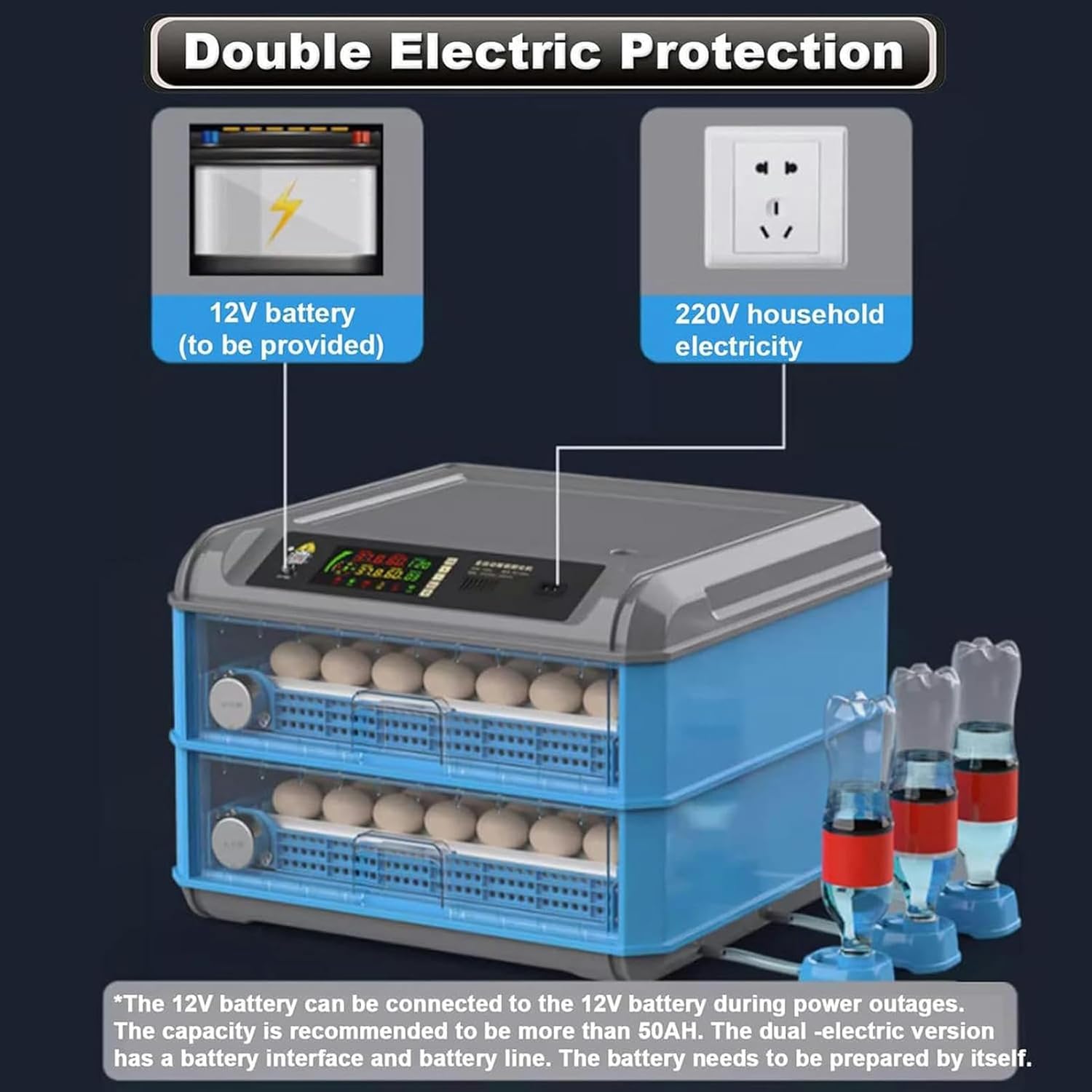 ★ FEATURES:- Built in LED egg candling lamp for observing the growth of the fertilized eggs.- Simplicity design and versatile functions gives you full visibility to monitor the hatching process.- It features solid molded construction and all the built-in electronics you need.- With digital temperature control system, Built-in Fan and the water chamber.- Automatic egg turning, LED digital temperature control with readout,temperature alarm & easy observation.- Saving Space - Very little space needed to use this incubator - you can just put it on a small table.★ PRODUCT PARAMETERS: Type: Digital Automatic Incubator Power Supply:110/220V Materials:Pc+Abs Color: Gray Blue Size: 53.5×53×36Cm,53.5×53×47Cm Capacity:Choose From Options Of 128,192,300, Or 500 Eggs Weight: 12.15Kg,15.16Kg Application: Chicken, Duck, Goose, Pigeon, Quail Eggs, Etc.★ WHAT YOU WILL RECEIVE:1 x Egg Incubator1 x User manual1 x Power cablePlease note that water bottles need to be prepared separately (various self-use bottles can be used), as the provided renderings are for demonstration purposes only.