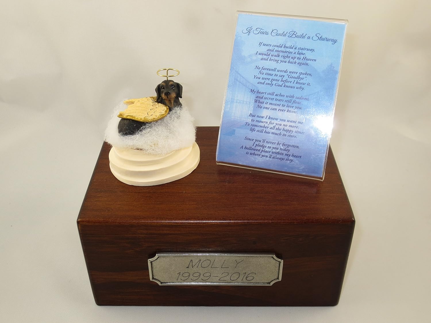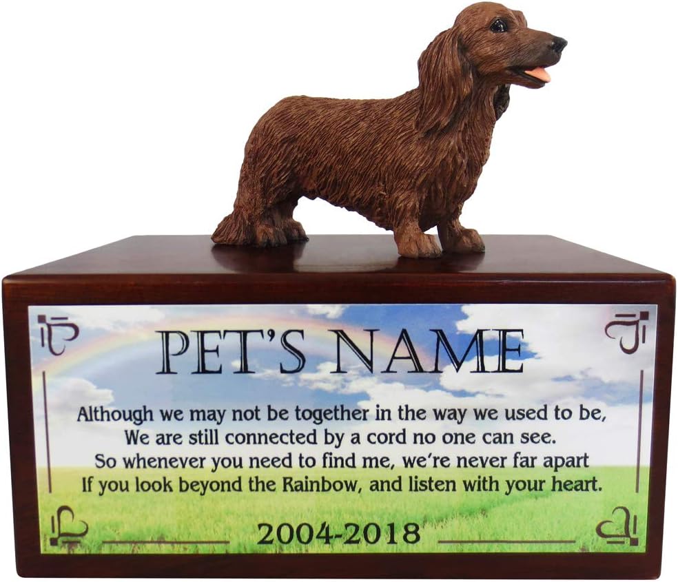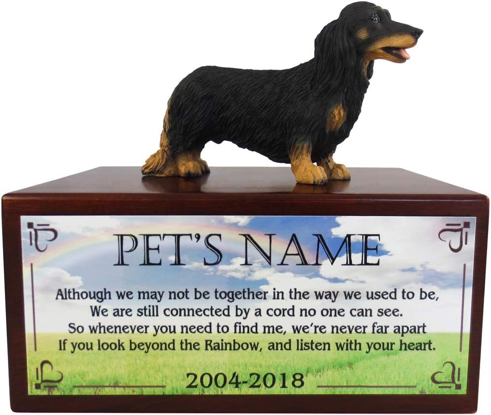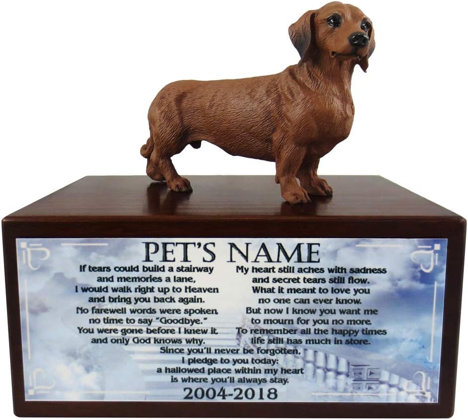 Each urn comes with a hand sculpted, hand painted, and very realistic figurine from Conversation Concepts, the leader in pet gift ware. For shipping purposes, figurine is shipped "unmounted" which allows you to position it the way you prefer. Instant glue is included to permanently secure the figurine to the urn as you like. Beautiful sublimated poem on aluminum or high quality Danforth engraved pewter plate attached to face of urn. Personalization is available. Please fill out personalization field when checking out. This is our small size urn and will hold the cremains of up to a 30 pound pet. We offer over 300 breeds and species of dogs, cats and animals in 3 different size urns. Please message me if you cannot find what you are looking for. There is a removable base to allow you to place the cremains of your pet, secured by a screw.