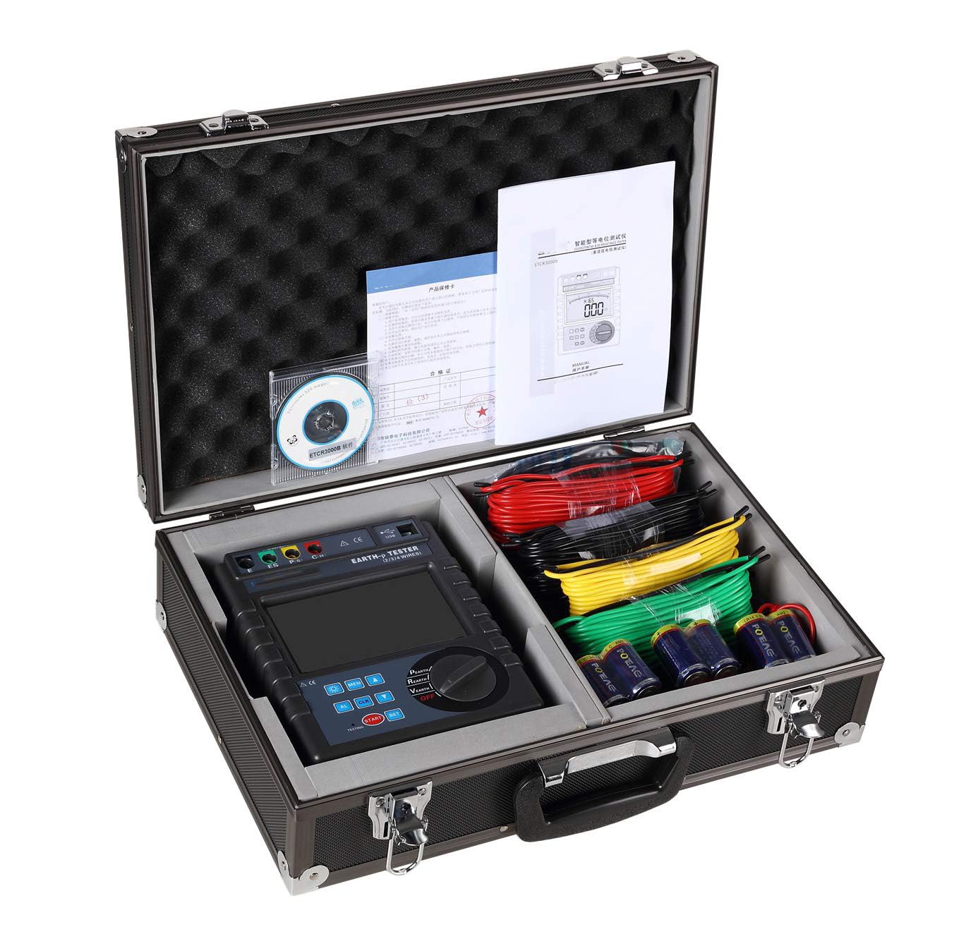Shipping Policy : Battery Not Included During the Shipping LCD size: 124mm x 67mm (with backlight) Range: Grounding resistance: 0.00Ω to 30.00kΩ (automatic shifting) Soil resistivity: 0.00Ωm~9000kΩm (automatic shifting) Grounding voltage: AC 0~600V Resolution: Resistance: 0.01Ω Soil resistivity: 0.01 Ωm Voltage: 1V Accuracy: ±2%rdg±3dgt Data storage: 300 groups Measurement method: Grounding resistance: precision 4-wire, 3-wire measurement, simple 2-wire grounding resistance Soil Resistivity: Quadrupole Method (Winner Method) Ground-to-ground voltage: average rectification (between P(S)-ES interfaces) Data Mode: Average, Maximum, Minimum Line resistance check: automatic verification Measurement time: Voltage to ground: 0.33 seconds/time; Grounding resistance, soil resistivity: 5 seconds/time Number of measurements: 5000 or more (short-circuit test, test 1, stop 30 seconds and then test) Test frequency: 128Hz/111Hz/105Hz/94Hz (AFC) Short circuit test current: AC 20mA max; Open circuit test voltage: AC 40V max Test voltage waveform: Sine wave Electrode spacing range: Can be set from 1m to 100m Data retention: "HOLD" symbol display; Data Review: "READ" Symbol Display; Overflow display: "OL" symbol display Auxiliary grounding test: Auxiliary grounding resistance test function, 0.00KΩ to 30kΩ (100R+rC<50kΩ, 100R+rP<50kΩ) Interference judgment: Automatically identify the interference signal, the "NOISE" symbol indicates when the interference voltage is higher than 5V Alarm function: When the measured value exceeds the alarm setting value, the "beep - beep - beep - -" alarm prompt Insulation resistance: 20MΩ or more (500V between circuit and case) Pressure resistance: AC 3700V/rms (between circuit and housing) Power Supply: Battery No. 2 1.5V (LR14) x6 section(Battery not included in the package)