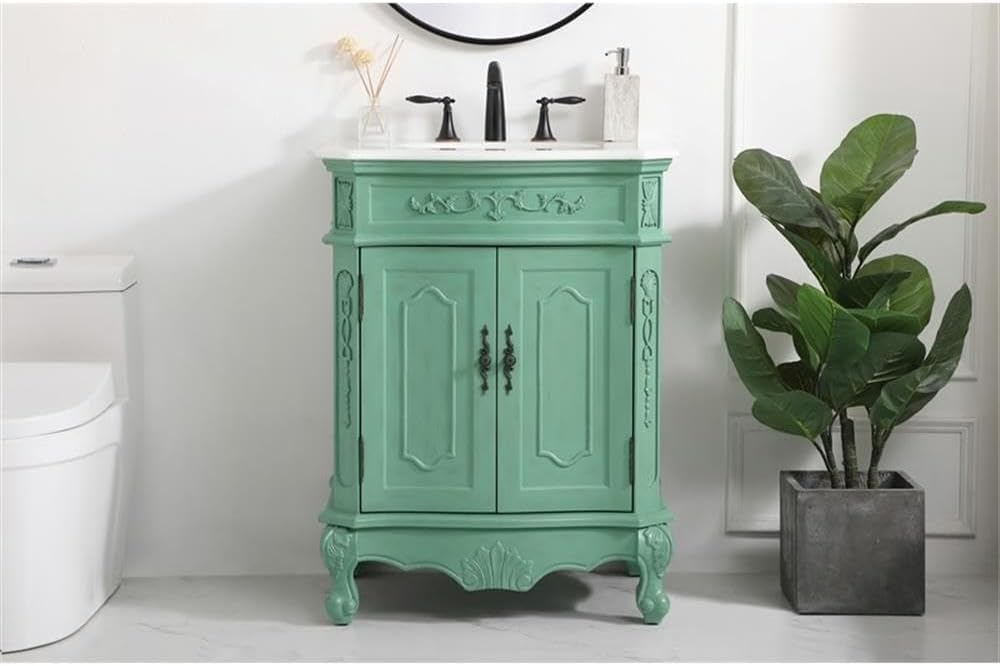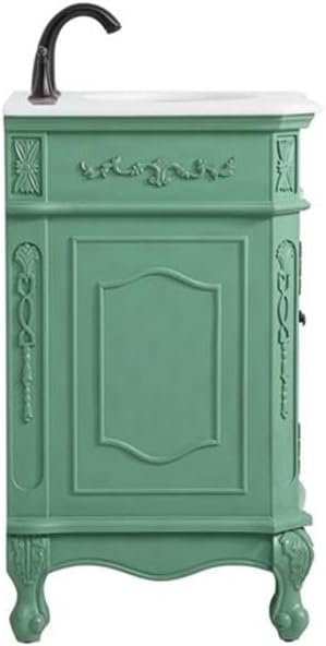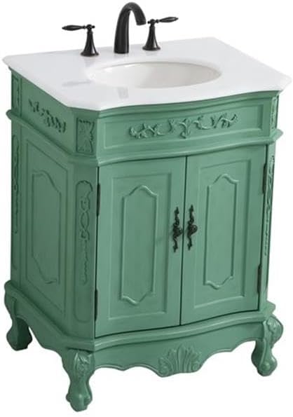 This superb balance of timeless tradition and opulent beauty in a quartz-topped vanity will certainly enhance the aesthetics of any home or office bathroom! Featuring an ivory white durable quartz countertop complimenting the hand painted cabinet with a delicate carved floral design, stands on stylishly carved solid wood French scroll feet. Don't let the design fool you, the quartz countertop and porcelain undermount sink allows for space to get ready, while the antique bronze hardware allows you to discover storage spaces with ease. You and your guests will marvel at this vanity that will both store away your bathroom essentials and enhance the aesthetics of your room.Features:- Material: Aluminum alloy, solid wood, MDF, porcelain, birch, quartz- Finish: Vintage mint green, ivory white- Designed with an Ivory white quartz countertop with ogee edge cut- Comes with an undermount oval porcelain sink- Designed with cabinet doors attached to magnetic latches to secure the door shut- Two doors open to a storage compartment in the cabinet- 8 inch spread predrilled three faucet holes - faucet is not included- Crafted with solid wood legs and engineered wood panels- Built with a removable shelf, perfect to store your bathroom essentials- Room use: Bathroom- Product shape: Rectangle- Hand painted: Yes- Countertop edge style: Ogee- Number of sinks accommodated: 1- Sink mounting type: Undermount- Sink shape: Oval- Vanity mounting type: Free-standing- Soft close doors: Yes- Leg design: Bending legs- Any certification: Yes- Faucet holes: 3- Number of cabinets: 1Specifications:- Product Dimensions: 36"H x 21"W x 27"D- Product Weight: 99 lbs- Product Dimensions: (Countertop) 0.75"H x 21"W x 27"L- Product Weight: (Countertop) 29 lbs- Product Dimensions: (Sink) 7"H x 16"W x 13"D; (Sink drain hole size) 1.75; (Sink drain distance from side edge of countertop) 13.5- Product Weight: (Sink) 12 lbs- Product Dimensions: (Door handle) 0.79"H x 0.91"W x 5.43"L; (Door thickness) 0.5- Product Dimensions: (Faucet hole size) 1.38; (faucet hole spacing) 8"3; (Faucet hole distance to top edge of countertop) 9.5; (faucet hole distance to side edge of countertop) 2.75- Product Dimensions: (Cabinet interior) 19.75"H x 20.5"W x 17"D- Product Dimensions: (Distance between shelf and cabinet/sink) 0.5- Shelf Dimensions: 20.5"W x 16"D; (thickness) 11.25"- Leg Dimensions: 7.5"H x 3"W x 3"D- Number of Doors: 2- Number of Shelves: 1- Weight Capacity: 25 lbs- Warranty: 1 year