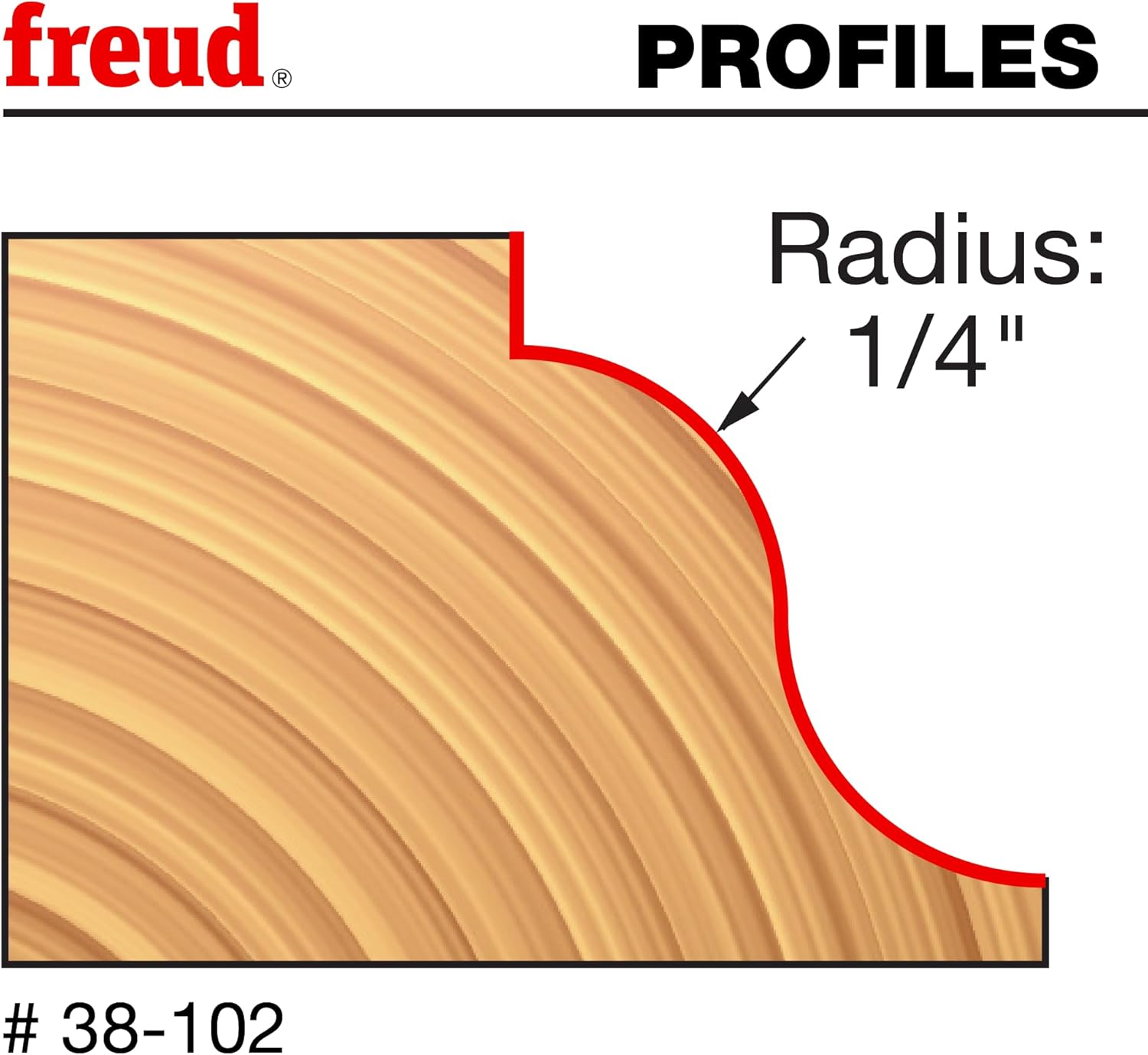 Product Description 1-3/8" (Dia.) Roman Ogee Bit (Quadra-Cut) From the Manufacturer Freud's precision ground carbide bits have a grain size smaller than other grades, and titanium is added making them impervious to chemical attack. Promoting safer woodworking is the reason Freud made a commitment to develop anti-kickback router bits. Bits are computer balanced to insure vibration-free operation at speeds that are a safe margin above the typical 22,000 RPMs of most routers. Freud's philosophy is woodworkers should expect safety, not pay for it. Over all diameter 1-3/8-inch, large radius-1/4-inch, shank 1/4-inch.