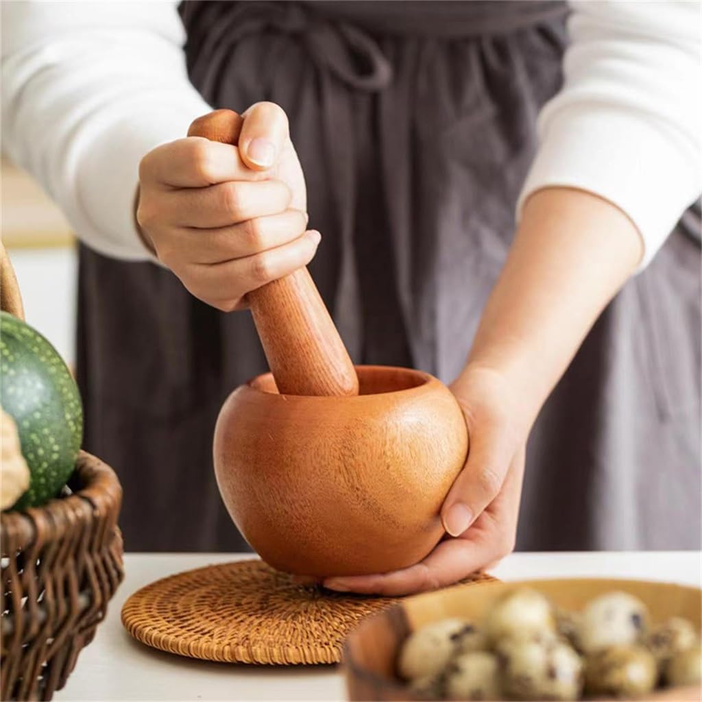Professional kitchen garlic buckle pot bottom seat bowl mortar and pestle setUse a portable design and easy and safe useSolid garlic percussion stick, strong and , comfortable gripDeepened, thickened barrel body, which is comfortably handled and easily groundEasy to clean and does not cause the grinder to retain the original spice flavorMaterial: woodDimensions: 9.5*7.5cmPackaging: 1 garlic processorCompact design takes up little space in your kitchen, and makes a great gift for new cooks to master chefs