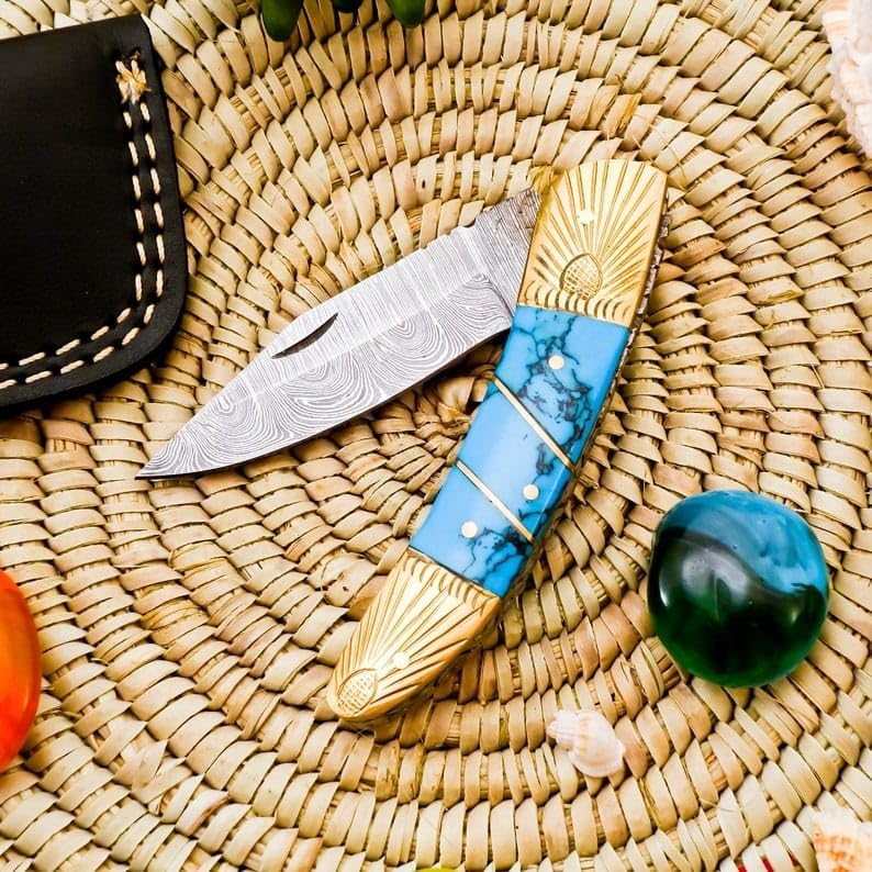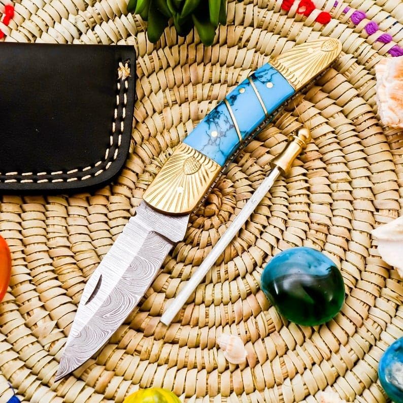 Elevate your everyday carry with this handcrafted Damascus pocket knife. Crafted with precision and care, this folding knife boasts a striking Damascus steel blade that showcases the intricate patterns formed by the layered steel. The handle is a true work of art, featuring a captivating blue marbled design complemented by brass accents. This pocket knife is not just a cutting tool but a statement piece that combines functionality and beauty. Whether you're an outdoor enthusiast, collector, or simply appreciate fine craftsmanship, this Damascus pocket knife is sure to become a treasured possession. Its compact size makes it perfect for slipping into your pocket or pack, ensuring you're always prepared. Treat yourself or surprise a loved one with this exceptional knife that promises years of reliable use and admiration.