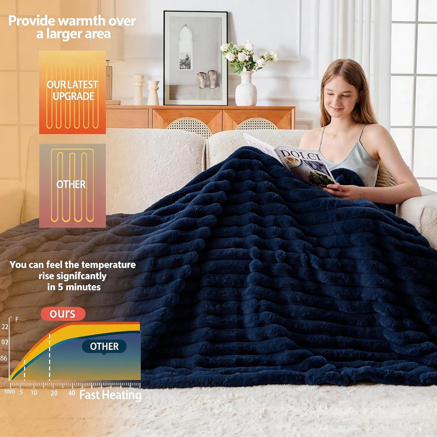 Heated Blanket Electric Thick Striped Flannel Heating Blanket Throw Blanket 50"x60" ,10 Heat Settings, 1-12 Hour Auto Off, Fast Heating Heating Blanket with Overheat Protection.