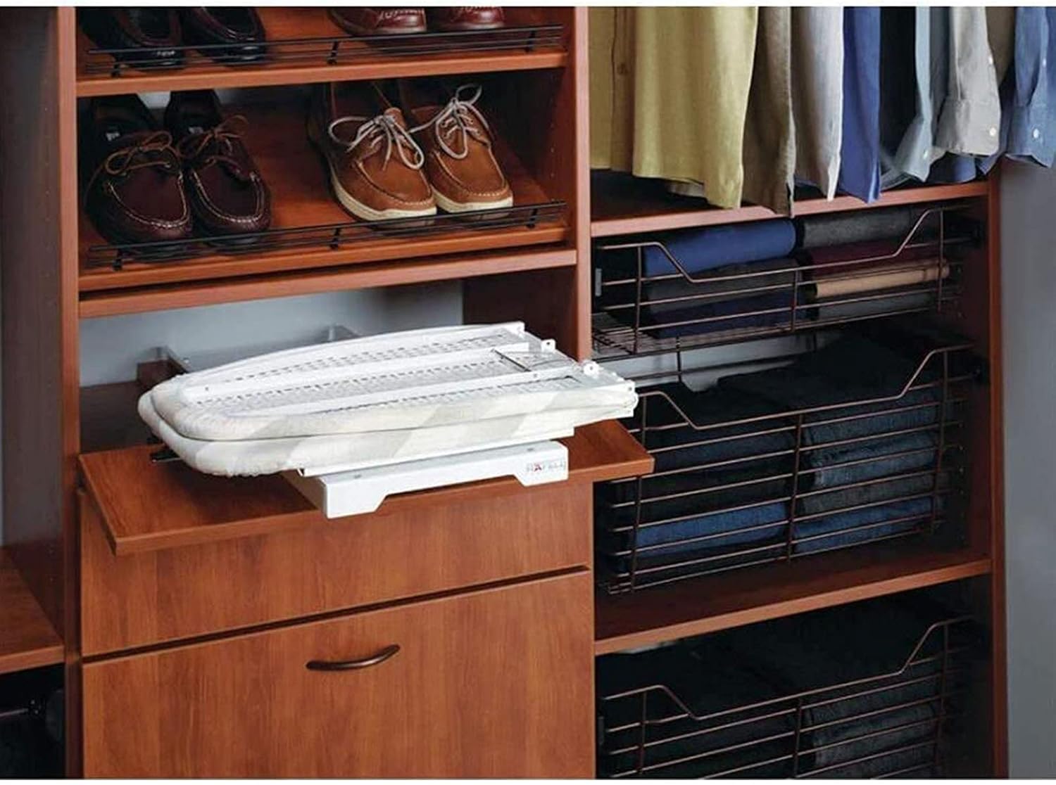 High quality, beautiful and valuable ,an adult can easily unfold and fold the ironing board Space-saving designBest of all, our innovative Cabinet Mounted Swivel design lets you install the ironing board in cabinet. So that it will help you saving space and make your room be more tidy. When you're ready to iron, just pull the quick-release lever to lower into position.Frame: powder-coated steelSpecifications:sise: 37.4x11.8 inchesIroning Board Cover: , suitable for machine washing and dry washingLoad capacity: 33 poundsPackage includes:1xIroning Board 1x cover1 set of Mounting screwsWidely application: This ironing board can be easily installed in a drawer or a closet which is sized above wide 20inch and depth above 14inch. Heavy Duty Steel frame,High Quality Anchors, Fasteners & Perforated Steel Frame Supporting Up to 33 Pounds | Unique Pad Design Allows Heat to Dissipate, Encouraging Quicker Wrinkle ReleaseSo, if you're short on space, skip the bulky boards that take up an entire closet! Add an Cabinet Mounted Swivel Style Ironing Board to your cart today!
