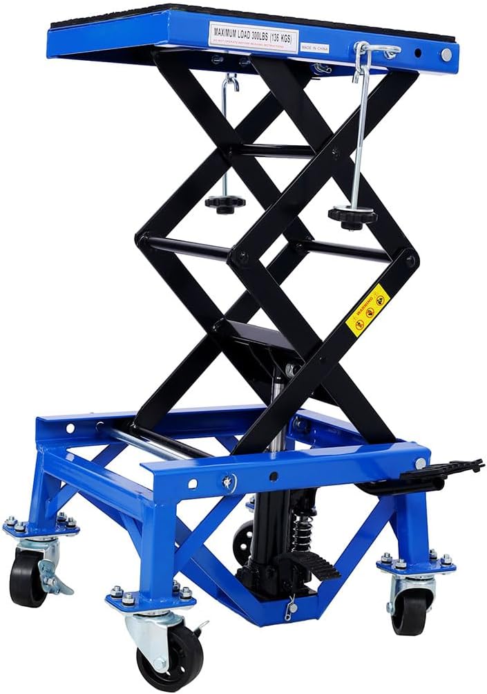 PRODUCT FEATURESOur secure elevation motorcycle stand is the ideal accessory for sport or dirt bike enthusiasts. The large rubber top surface lifts your wheels off the ground, providing enhanced access for maintenance and repairs. Plus, it also improves storage efficiency. This motorcycle lift jack is cleverly designed, easy to use, portable, and structurally sturdy, making it suitable for small personal vehicles such as dirt bikes, motorcycles, jet skis, snowmobiles, and ATVs.SpecificationMain Color: BlueMain Material: SteelProduct Dimensions: 15.70"×14.70"×36.20"Weight: 55 lbsPackage Size: 19.30"×17.70"×14.40"Weight: 60.90 lbs