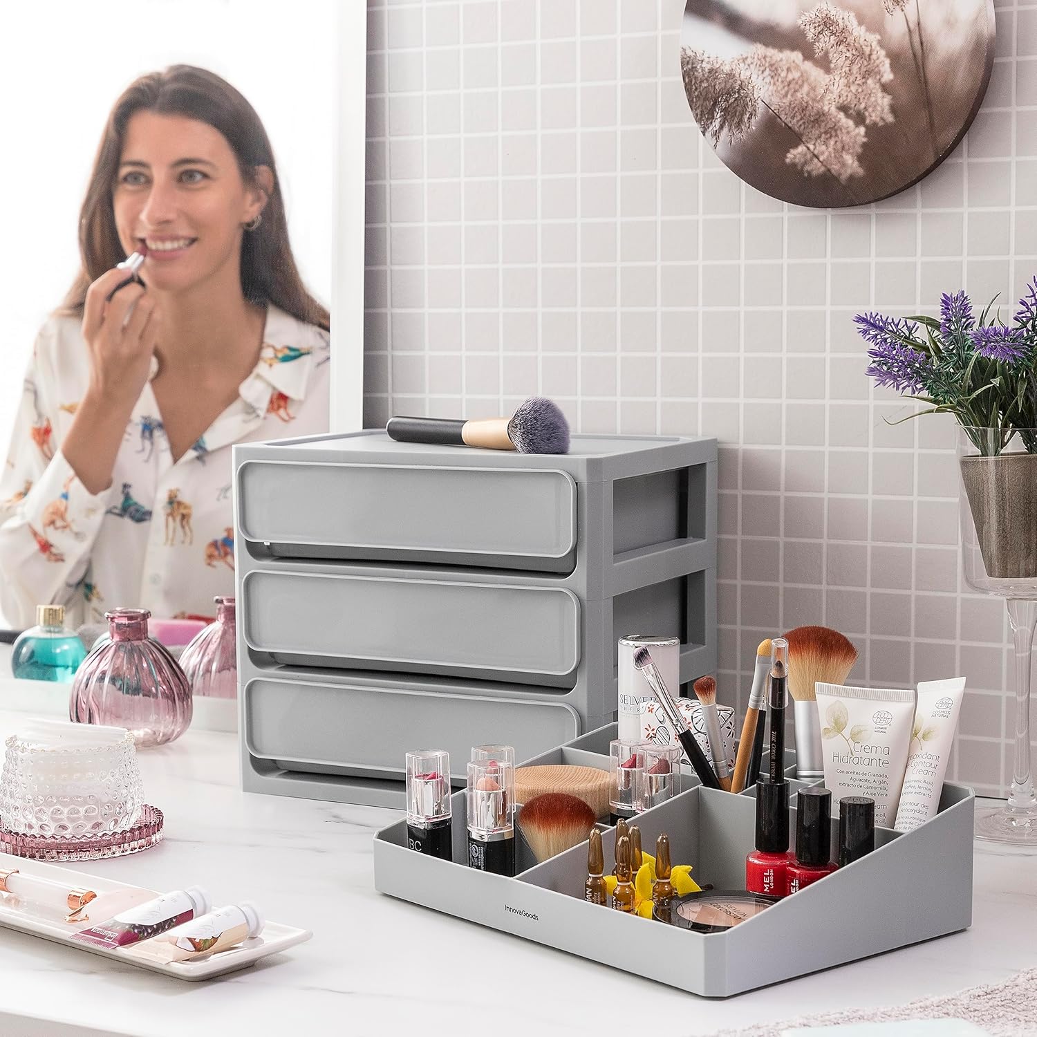 This practical portable cosmetic organizer allows you to conveniently have everything you need for makeup and care for yourself while taking up minimal space. Features 3 drawers and removable top tray with 9 different sized compartments. A versatile makeup organizer to always keep your beauty products, jewelry, etc. handy and well organized. Ideal for mascara, eyeliners, lipsticks, blushes, etc.