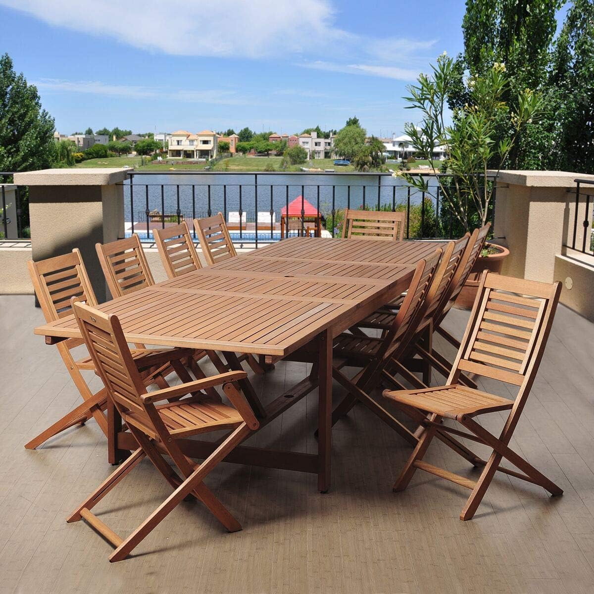 Great quality, elegant design patio set, made of solid eucalyptus wood. FSC (Forest Stewardship Council) certified. Enjoy your patio with style with these great sets from our Amazonia outdoor collection.Features:- Finish: Brown- Material: High Quality Eucalyptus Wood (Eucalyptus Grandis)- Folding armchairs and chairs- 11 individual pieces- FREE WOOD PRESERVATIVE for longest strap durability.- It works great against the effects of air pollution salt air, and mildew growth.- Great functionality.Specifications:- 8 Chairs: 36"H x 18.5"W x 25.5"D- 2 Armchairs: 36"H x 19.5"W x 25"D- 1 Extendable Rectangular Table: 29"H x 42"W x 79-118"D.