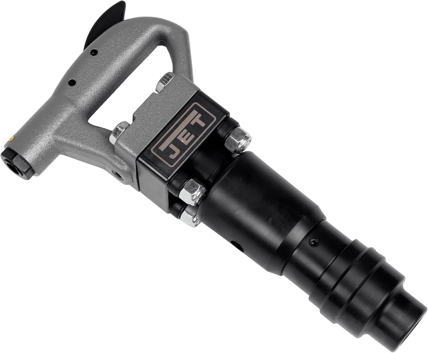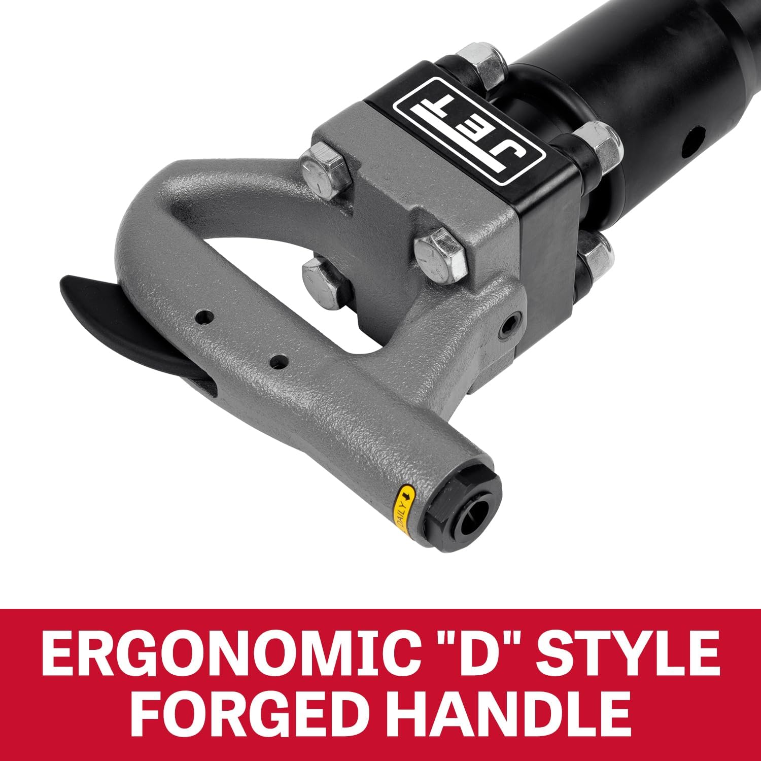JET Chipping Hammers are available in two heavy-duty designs with multiple capabilities. The Four-Bolt D-handle model is designed for extra strength and provides better grip. The Saw Tooth handle model is engineered to dissipate the impact energy more efficiently. Each type has the option of round or hex shaped bushing shanks. Each model can accommodate standard oval collared chisels and retainers, making these heavy-duty Chipping Hammers a staple on any construction site.