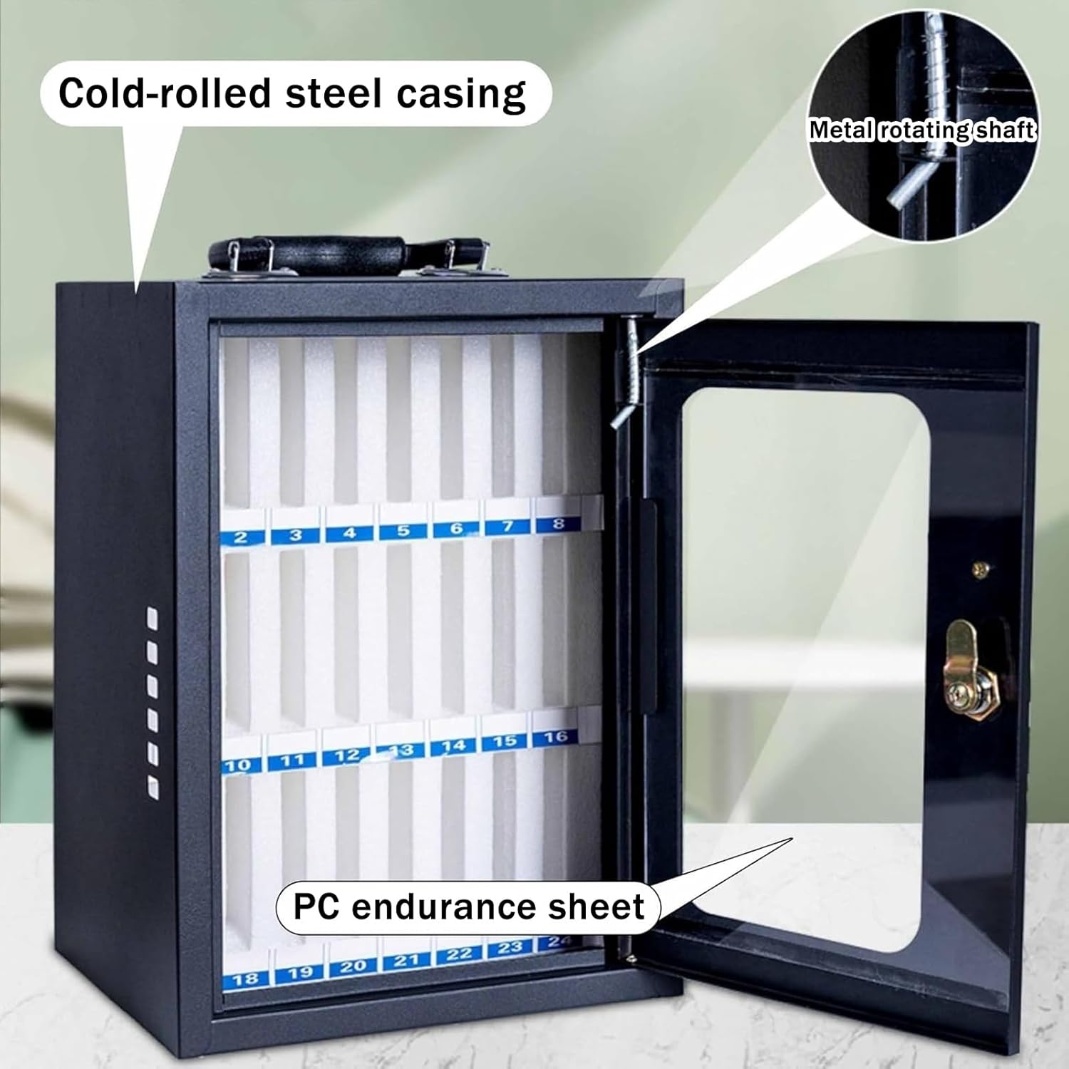 JKGHK steel phone organizer features multiple slots to securely lock your smartphone, providing a safe and reliable storage solution for your valuable device.The clear acrylic glass door allows users to easily locate, store, and monitor their phones without opening the cabinet, enhancing organization and accountability.Multiple cooling vents on both sides of this organizer ensure smooth airflow.The wall mount buckle on the back allows for easy wall hanging without falling off.Product Name: Cell Phone Storage/Phone Locker Box/Phone Storage Box/Phones Storage Cabinet/Pocket Mobile Phone Storage CabinetMaterial: Metal Style: ModernColor: BlackNumbers of Slots: 12-bit , 24-bit , 36-bit , 48-bit , 60-bitMounting Type: Wall Mount, FreestandingApplicable Places: Schools, classrooms, conference offices, factories, restaurantsPackage Contents:Cell Phone Storage Box × 1 (Does not include other items shown in the pictures)Notice:1. Due to manual measurement, please allow 1-3 cm error.2. Due to factors such as light and display, the actual item received may be different from the picture. Please refer to the actual product.3. We only have Cell Phone Lock Box, other products are only used as scene props for reference.