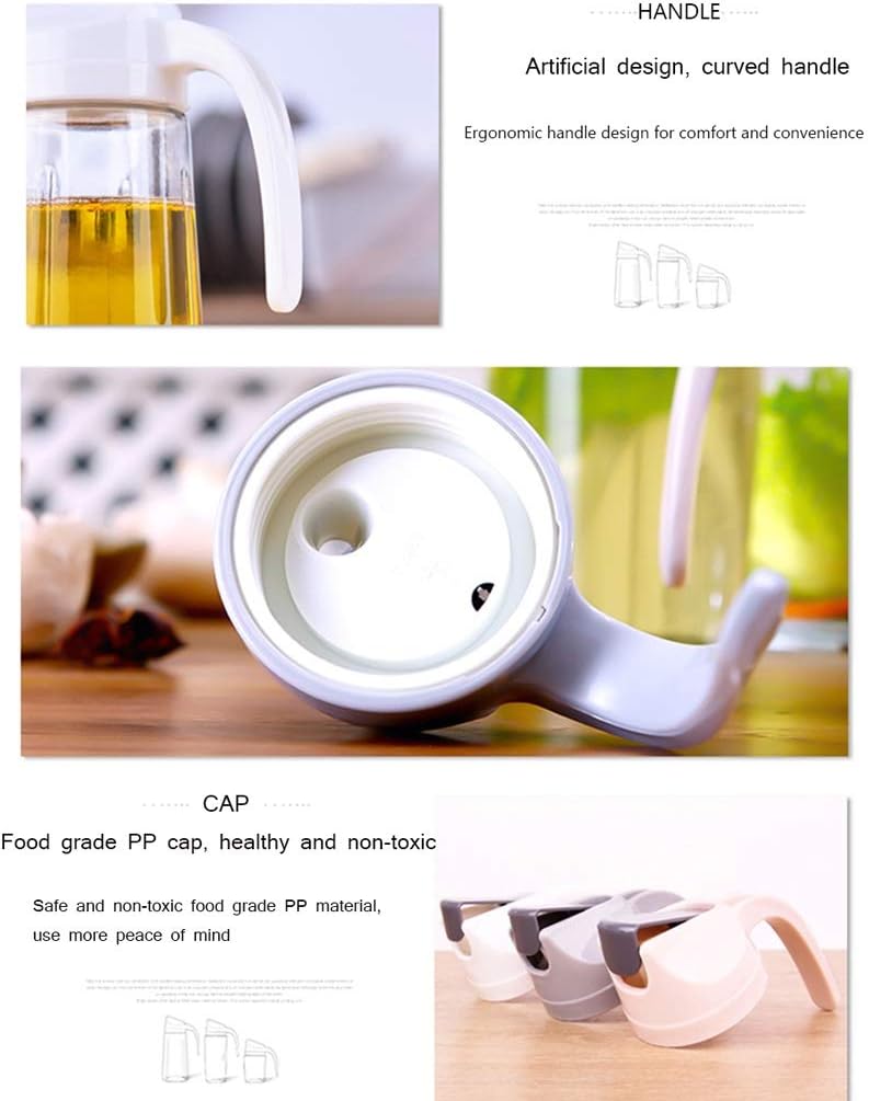Features:- Safe and food grade PP material, use more peace of mind.- Ergonomic handle design for comfort and convenience.- The principle of leverage is adopted, no need to , only the cap is tilted, the lid is automatically opened, and the utility model is convenient to use.- Threaded non-slip bottle bottom, not easy to dump.Notes: - 1-2mm error might exist due to manual measurements, The colors deviation might differ due to different monitor , please kindly understand. - We provide you with the best product and service. If you have any problem, please let us know, and we will solve the problem ASAP. Thank you so much.SpecificationMaterial: PP Resin + silica gel + glassColor: Gray, White, BeigeCapacity: 600mlSzie: 600ml 21*6.5cm/8.2*2.5inch1 x Oil can(Does not include other items)Product DetailsThis is a perfect seasoning can set for families, cafeterias, cafes, etc,and more to meet your various purpose.