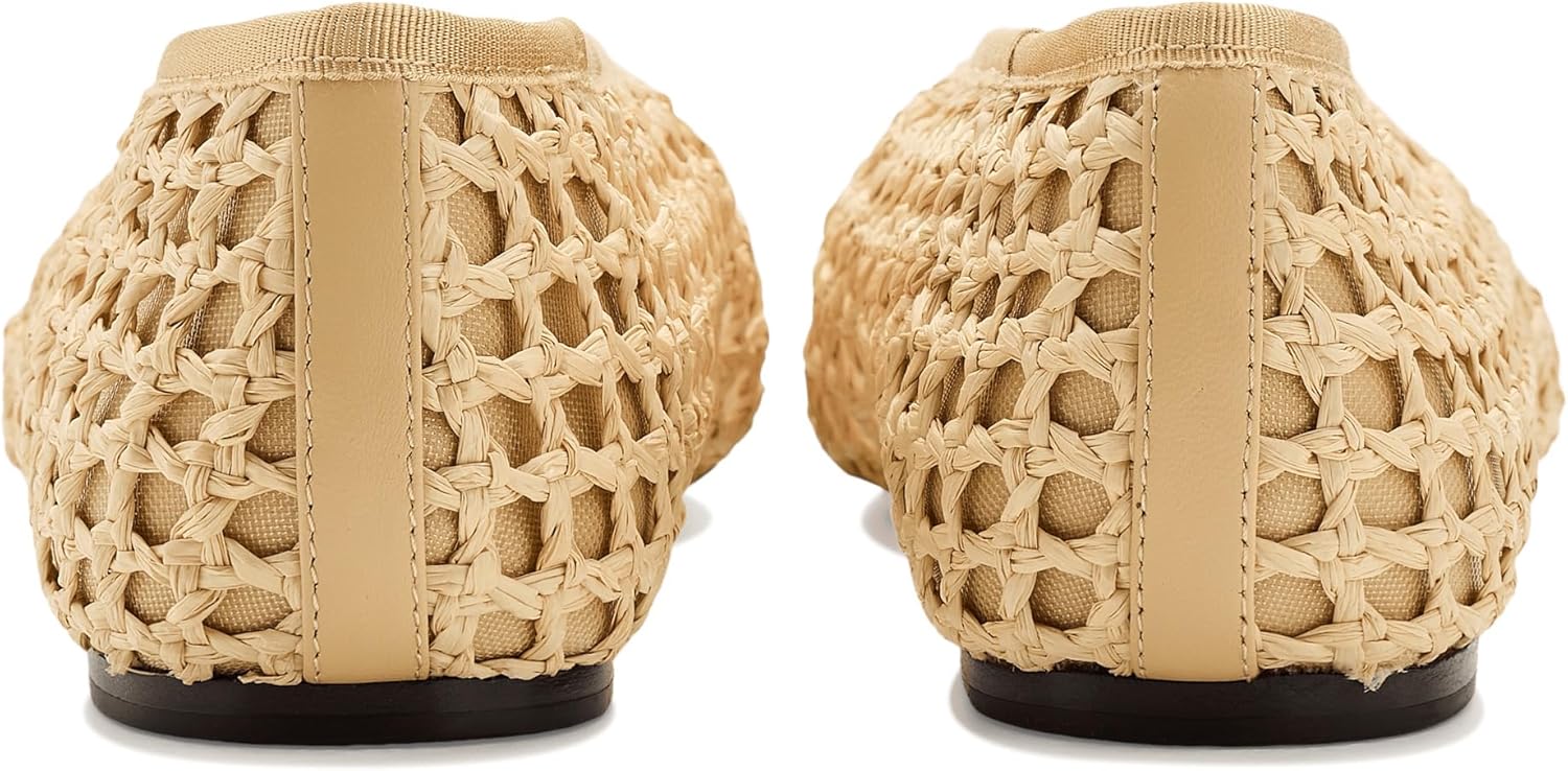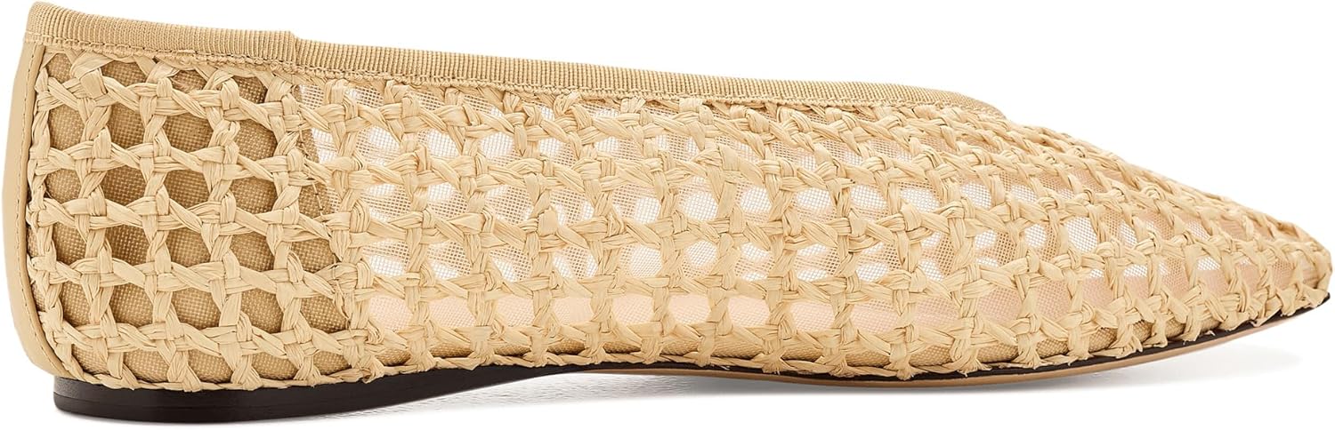 Square toe ballet flat in natural crocheted raffia. Features padded footbed with gold stamped logo. Slips on.