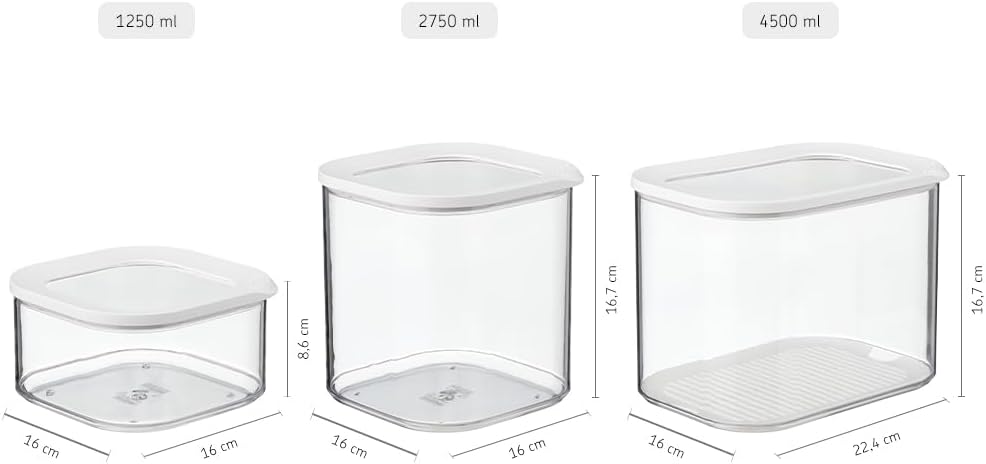 Rosti "Modula". You might be very fussy, but Modula storage boxes take this into account. The boxes are modular stackable, stable and dishwasher resistant. You can even see the contents from the top through the lid if your containers are in drawers. The different sizes are adapted for storing all the common dry ingredients.
