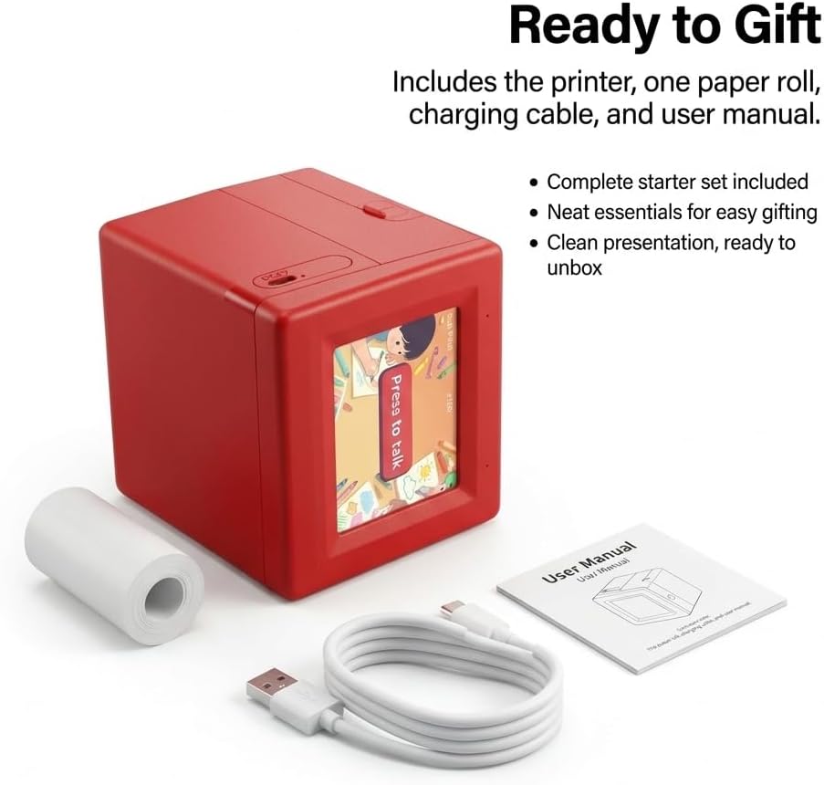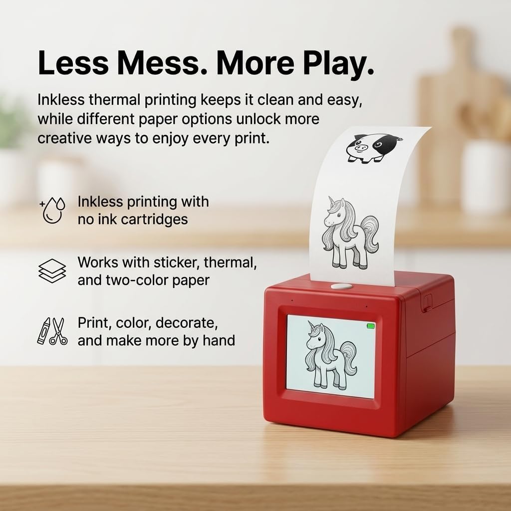 :Make gift time feel more magical with a mini sticker printer designed for creative fun. Instead of being just another ordinary toy, this compact device gives kids a more interactive way to play: press, speak, preview, and print. With its built-in screen, children can view the design before it prints, adding more excitement and participation to every use. The inkless thermal printing design helps keep daily use simple, with no ink cartridges to replace. After printing, the fun keeps going—kids can color printed designs, use sticker paper for decorating, or turn simple prints into DIY crafts. Its compact size, lightweight build, built-in 1200mAh battery, WiFi connection, and Type-C charging make it easy to use around the home or bring along for family visits, travel, and holiday gatherings. Compatible with thermal paper, sticker paper, and two-color paper, it offers more ways to create beyond a single use. Whether you are shopping for a birthday surprise, holiday gift, or creative reward, this kids mini thermal printer brings together novelty, hands-on fun, and a memorable unboxing experience.