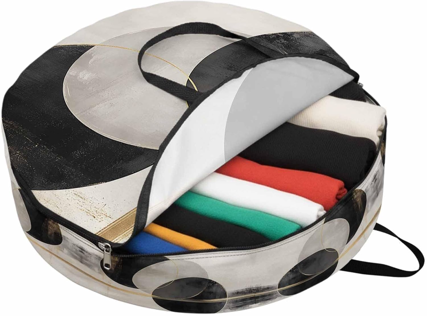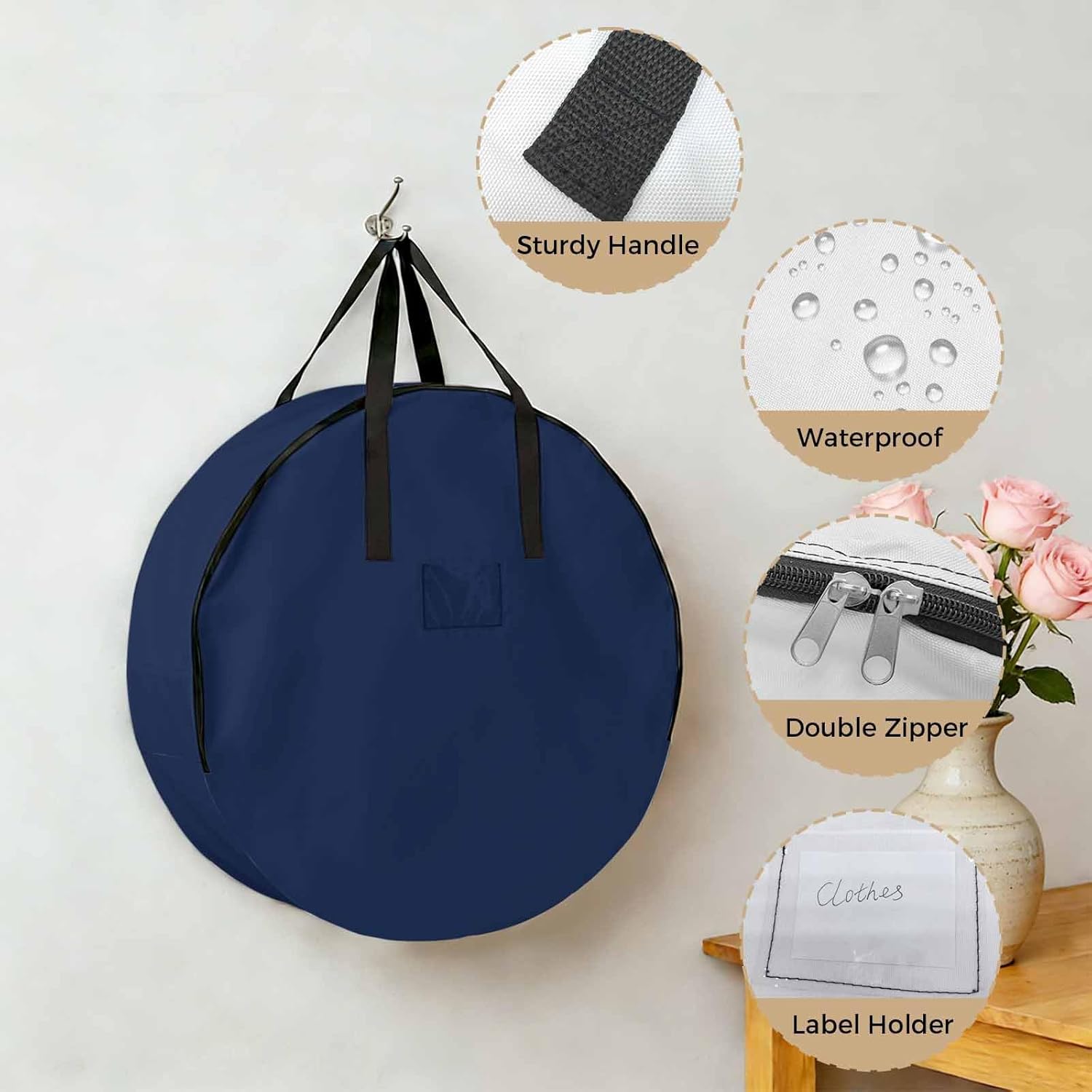Reclaim Your Closet Space with the Round Storage Solution! Material: polyester Diameters: 24 inch, 30 inch, 36 inch Depth: 7 inches Package Includes: Round Storage Bag One Bag, Endless Possibilities: Whether you are swapping out your summer wardrobe, moving into a new dorm, or packing away holiday decorations, this bag has you covered. The circular design is uniquely suited for: Bedding: Comforters, quilts, sheet sets, and oversized pillows. Clothing: Winter coats, sweaters, and bulky ski gear. Home Decor: Holiday wreaths, garlands, and floral arrangements. Outdoor Gear: Camping blankets, sleeping bags, and beach towels. Dual Zippers: The high quality double zipper design allows the closet organizer to open wide from both sides, making it effortless to load and unload even the bulkiest comforters or wreaths. Reinforced Handles: Sturdy, reinforced handles are securely stitched to provide extra strength and a comfortable grip when carrying heavy loads or pulling the bag from under a bed. Clear Label Pocket: A transparent built-in label holder allows you to quickly identify the contents of each bag without ever having to unzip it, keeping your storage perfectly organized.