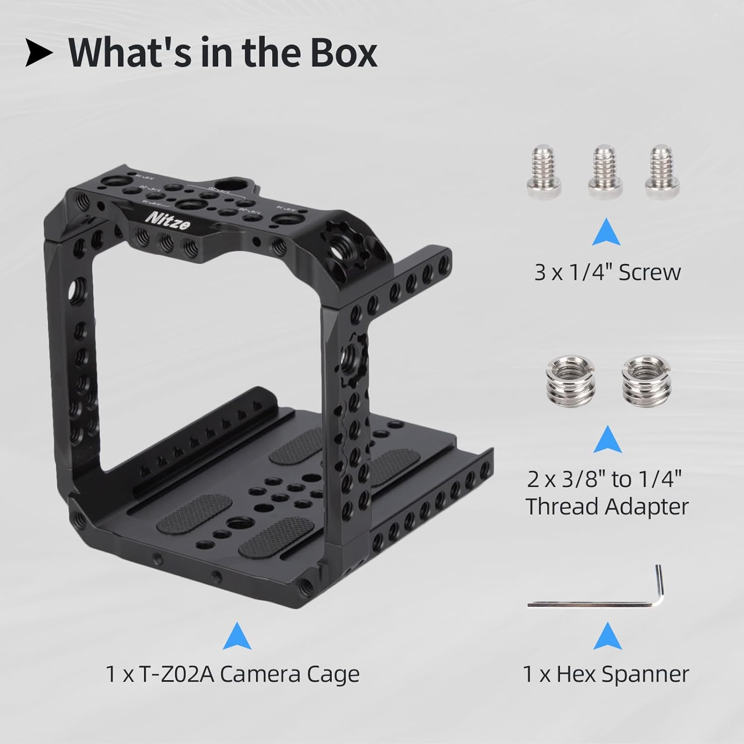 | BuiltIn Media | 1 x Hex Spanner, 1 x T-Z02A Camera Cage, 2 x 3/8” to 1/4” Thread Adapter, 3 x 1/4” Screw |