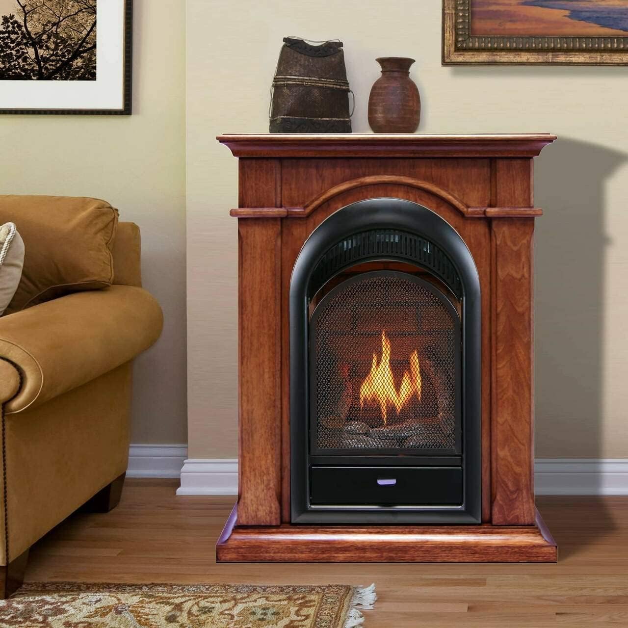 This ProCom Ventless Dual Fuel fireplace system, generating up to 15,000 BTUs, is a beautiful addition to your bedroom and home. Four ceramic fiber logs are hand-painted and illuminated by yellow flames for a warm, realistic look that can easily match your home décor. This system also features an Avery mantel with beveled Pallisters, rounded trim molding, a beautiful apple spice finish, and our only gas fireplace insert approved for use in your bedroom, meaning you can enjoy the warmth and ambiance of a fireplace all from the comfort of your bed. Product Features 15,000 BTU Natural Gas 15,000 BTU Liquid Propane Patented Dual Fuel Technology Zero clearance, Classic arched gas insert 4 hand-painted ceramic fiber logs Apple Spice Avery Mantel Thermostatic Control Single Precision Ported Ventless gas burner Safety Assurance: O.D.S. (Oxygen Depletion Sensor) Battery assisted Piezo ignition Safety Assured ANSI Certified System Designed for Indoor Use Only Some assembly required.