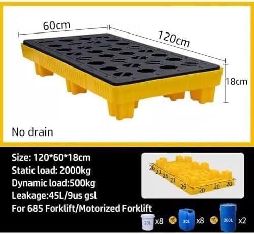 Modular Spill Platforms - Spill Isolation Sump - Load Capacity Isolation Tray No Spills No Hassle!!!! The seamless construction of this spill containment tray eliminates leaks and prevents unwanted spills, while the removable top grid makes cleaning easy.Suitable for use in a variety of industrial parks, warehouses, aquaculture, water storage and more.Name: Modular Spill Platform / Plastic Tray Material: Polyethylene Colour: yellow + blackFeatures:Wear-resistant Cold-resistant Strong load-bearing Additional features:Removable Flip-up Liftable Storage Push-pull Hydraulic Load-bearing capacity:Each size of pallet has a different load-bearing capacity, the larger the size, the the load-bearing capacity.Package Contents: Spillage avoidance platform x 1