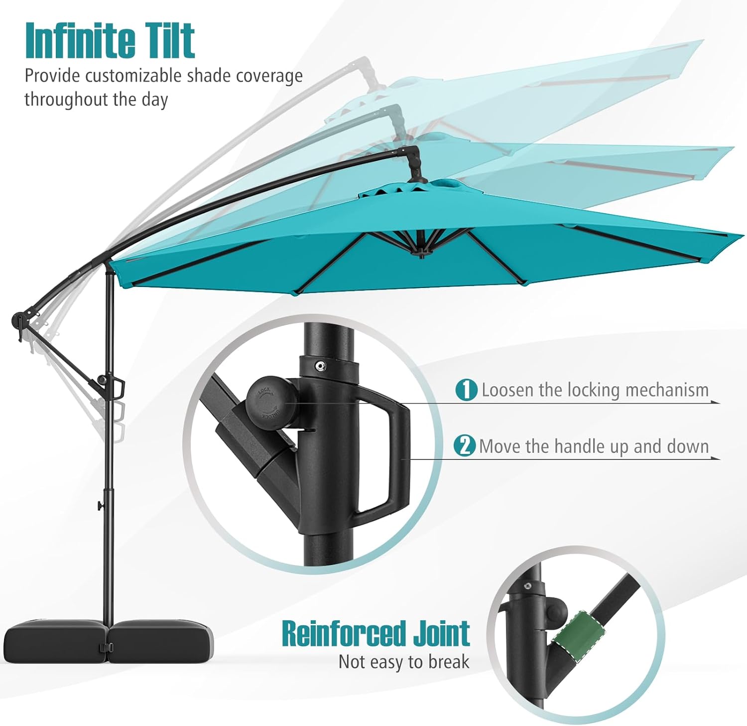 Description:Create a Comfortable and Shaded Oasis in Your Outdoor Space and Enjoy the Outdoors in Style!Our 10 ft/303 cm offset hanging umbrella with a base is a perfect shading solution for your patios, gardens, poolside areas, outdoor events, or even commercial areas, offering a generous shade coverage for various outdoor activities. Thanks to the umbrella's seamless ability to tilt and rotate 360°, customize your shade is a breeze, while the locking mechanism allows for easy operation. Built with a focus on stability and safety, it is equipped with an additional fixing strap, robust connectors, self-locking hinges, and 8 heavy-duty metal ribs, ensuring a secure and wobble-free structure. Moreover, crafted from 180 GSM dyed polyester canopy with a vented top, this hanging umbrella not only offers superior protection from outdoor elements but also enhances airflow for utmost relaxation. When not in use, we recommend closing the umbrella through a hassle-free crank handle, so as to extend its lifespan.Features:Includes a base, comes with 2 sandbags that could withstand a weight of 220 lbsThe infinite tilt and 360° rotation allow you to block the sun from different directionsEasy to tilt, loosen the locking mechanism and then move the handle up and down How to rotate, loosen the locking mechanism, rotate the canopy, and then lockEquipped with an additional fixing strap, enhance overall wind resistanceThe top connector adopts a self-locking hinge, prevent the canopy from swayingThe top connector is fully enclosed, prevent water seepage and internal rustingEquipped with protective rib pockets, prevent the canopy from tearingThe canopy is sun-protective, fade-resistant, water-repellent, tear-resistantFeatures an air vent on the top for optimal airflow and heat dissipationSupported by 8 robust metal ribs, ensure excellent stability and wind resistanceAdopts a crank handle with silent operation, easy and effortless to open or close the umbrellaSpecifications:Color: Beige/Gray/Tan/Turquoise/RedMaterial: Dyed Polyester Fabric, MetalProduct Dimensions: 10 x 8.5 ft (Dia. x H)Ground Clearance: 6.4 ftFolding Size: 2.6 x 2.6 x 7.8 ft (L x W x H)Net Weight: 28.5 lbsPackage Includes:1 x Patio Offset Umbrella1 x User’s Manual