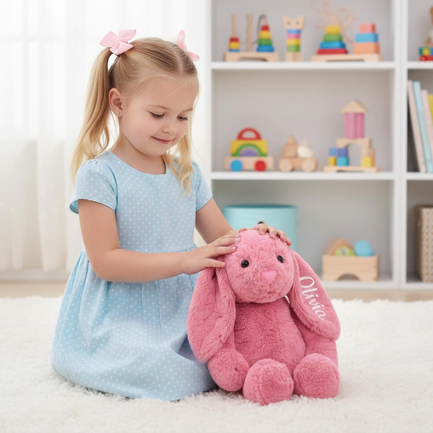 Celebrate Easter with our Custom Easter Bunny Plush, embroidered with your child's name. Whether you're putting together the perfect Easter basket or searching for a unique birthday surprise, this personalized plush bunny adds charm, warmth, and timeless memories to any occasion.Crafted from ultra-soft materials, this plush bunny feels gentle and smooth against sensitive skinideal for babies, toddlers, and young children. With its signature long floppy ears, embroidered facial features, and huggable fluffy body, it invites endless cuddles and warm embraces. The hand-stitched name gives it a truly personal touch, making it a beloved keepsake to treasure for years to come.Designed with versatility in mind, this bunny is perfect not only for Easter morning but also for birthdays, christenings, or as part of a spring-themed nursery. Its compact size makes it easy to carry along, snuggle during naps, or display on a shelf. Parents love the thoughtful design, while kids adore its sweet, huggable softness.Whether you're gifting for a boy or girl, or surprising a new mom or grandparent, this custom embroidered bunny is a heartfelt way to show you care. Make this Easter truly magicalwith a bunny as unique as the child who receives it.