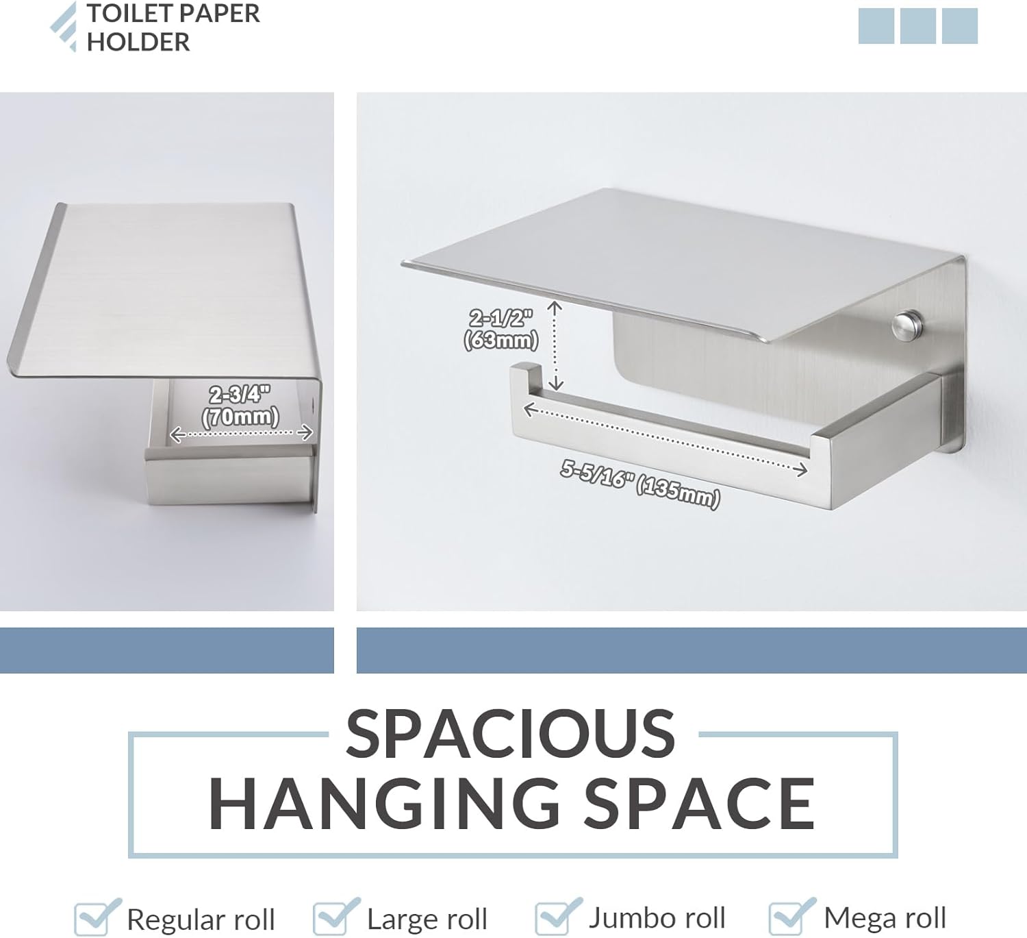 Finish: Brushed NickelInstallation Method: Wall-mountedDOUBLE ROBE HOOKMaterial: 304 Stainless SteelDimensions: L 3-11/16" x D 2-3/4" x H 1-1/4"(94 x 70 x 32mm)Net Weight: 0.27 lb (122g)PAPER HOLDER WITH SHELFMaterial: 304 Stainless SteelDimensions: L 6-7/8" x D 5-5/16" x H 3-9/16"(174 x 135 x 90mm)Net Weight: 1.12lb (508g)CARE AND MAINTENANCE1.ONLY clean with a soft, damp cloth gently.2.DO NOT USE detergents as they may harm the protective finish of your bath accessories.3.Maintenance period is 1-2 months, this care will maintain the metallic gloss finish.WARM PROMPT1.NOTE: All photography props are NOT included in the package.2.Manual measure may occurs a little dimension deviation, please in kind prevail.3.Due to light influence and display resolution, pictures and objects may have slightly color aberration.