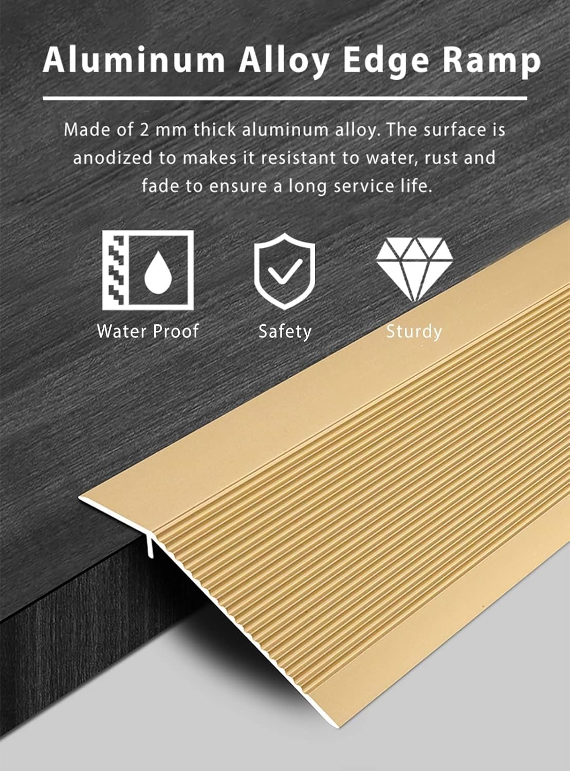 Enhance the safety and aesthetics of your home with our premium Aluminum Alloy Transition Strips. Designed to seamlessly cover the gaps between two flooring surfaces, these strips not only protect the edges of your floors but also provide a secure walking surface, making them ideal for homes with children and the elderly. Crafted from high-quality aluminum alloy, our transition strips feature a sleek and modern design that complements any room décor. The strips are 10 cm wide and 1.5 mm thick, providing a sturdy solution for height differences between 8 mm to 40 mm, accommodating various flooring types. With a length of 90 cm, they can withstand a maximum load of 250 kg (550 lbs), ensuring durability even in high foot traffic areas. Installation is a breeze; our transition strips require no nails or screws, making it easy for anyone to upgrade their space without the hassle of complicated tools. Plus, they are easy to clean, maintaining their appearance over time while enhancing the safety of your home by reducing tripping hazards. Whether you're renovating your entryway or simply looking to improve the flow between rooms, our Aluminum Alloy Transition Strips offer the perfect blend of functionality and style. Experience peace of mind knowing that you’re making your home safer and more inviting. Please note: There may be slight variations in measurements and color due to manual measurement and display differences. For any questions or concerns, feel free to reach out to our customer service team, who are ready to assist you. Upgrade your home today with our reliable and stylish transition strips!