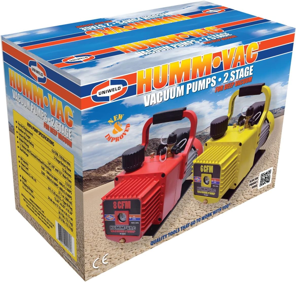 Uniweld HVP6 HUMM•VAC vacuum pump removes moisture and dehydrates a system quickly and efficiently. The HVP6 model operates at 6 CFM, has an oil capacity of 1 quart (946 ml), and a micron rating of 15. All HUMM•VAC models include the following: non-slip rubber hand grip, dual voltage power box (110/220), slant back center balanced handle, powerful low decibel fan cooled motor, heat dispersing motor and reservoir fins, sure grip rubber foot pads, low profile easy access oil drain, beveled reservoir pan for complete oil drainage, large sight glass for easy oil monitoring, oil fill port, exhaust dome, and 3 way intake fitting (1/4”, & 3/8” Male Flare; 1/2" Acme) with tethered caps.