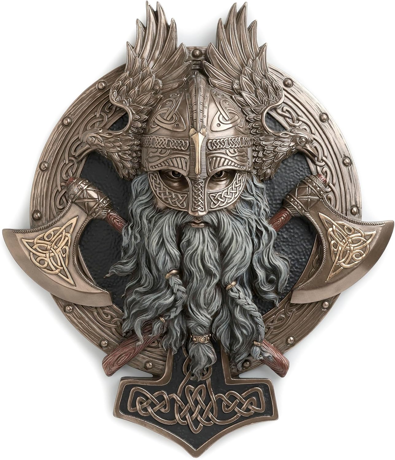 The Viking Berserker Twin Axe Valhalla Wall Plaque captures the fierce spirit and mythological allure associated with the legendary Norse warriors known as berserkers. These formidable figures, often depicted in sagas and historical accounts, were said to enter battle in an uncontrollable, trance-like fury that granted them superhuman strength and endurance. The intricately detailed design of the plaque reflects themes of Norse mythology, embodying the might and mystical essence of Valhalla, the grand hall where warriors hoped to be received by Odin after their deaths. This piece celebrates the rich cultural tapestry of the Viking Age, evoking the fearless spirit and heroic tales that continue to inspire fascination with the medieval Norse world.
