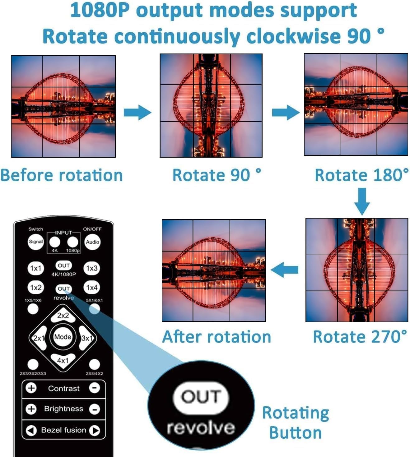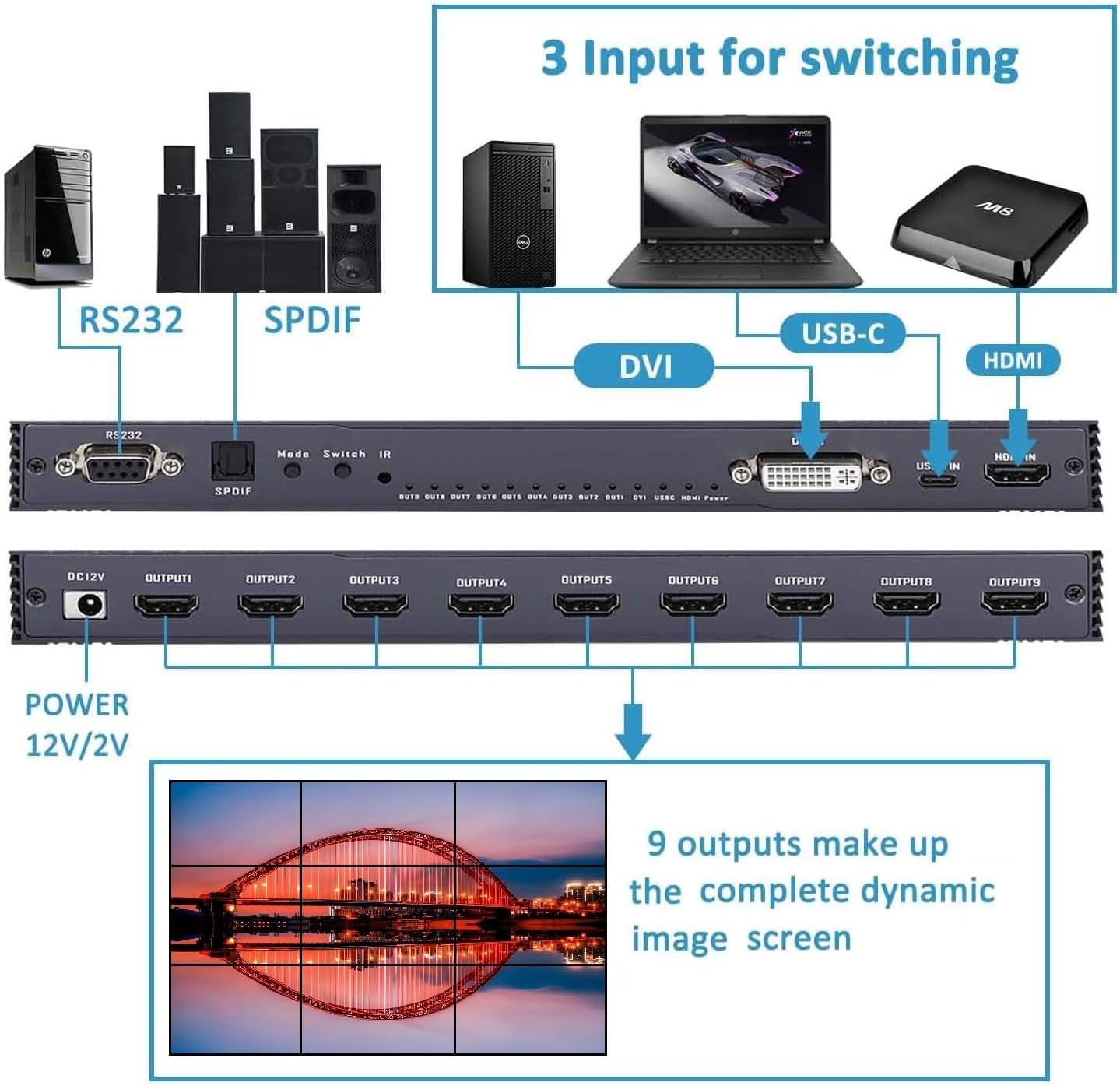 Multi-Interface Switching: 9x HDMI output, 1x DVI input, 1x USB-C input, 1x HDMI input,The main function is to divide a complete HDMI high-definition image signal into 9 blocks and assign them to 9 video display units, such as rear projection units, LCD TVs, etc. Complete a large dynamic image screen composed of 9 HDMI high-definition video display units