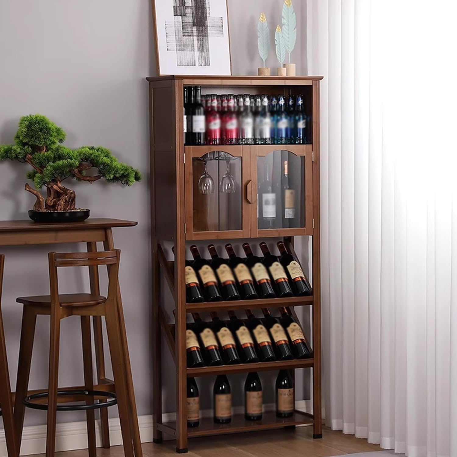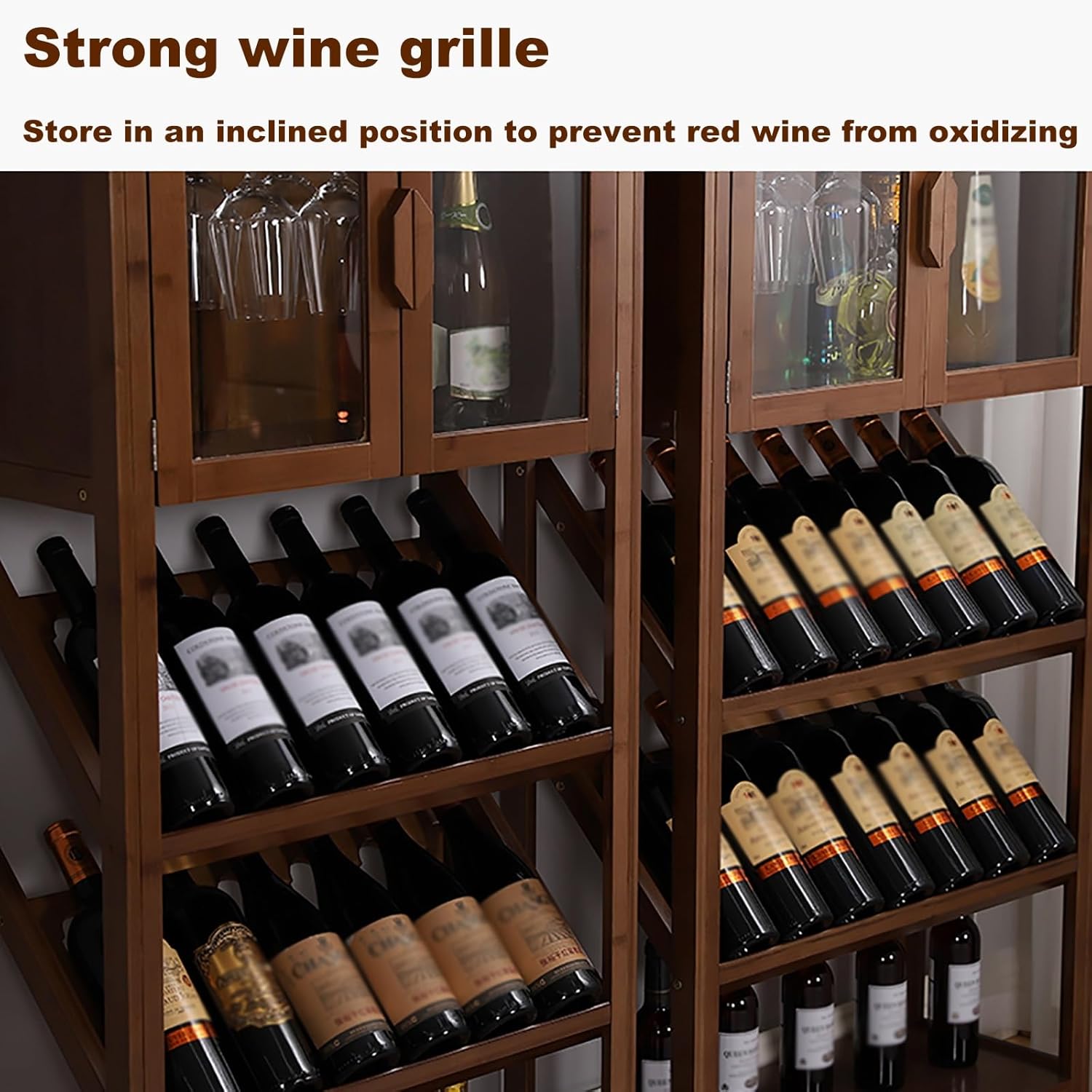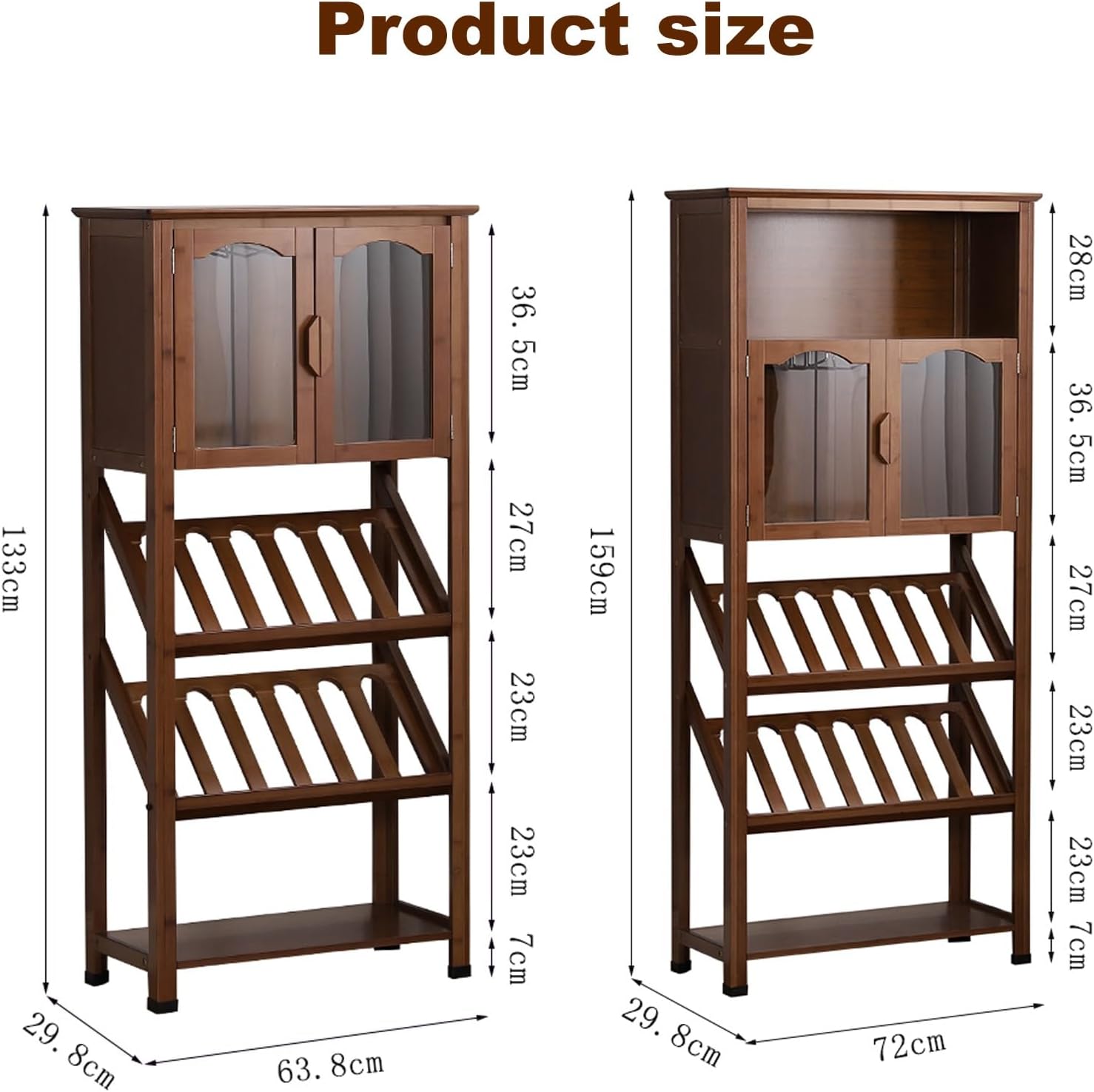 Product SpecificationsProduct Name: Whiskey Rack/Wine Rack/Bar CabinetProduct Color: BrownProduct Width: 29.8cmProduct Length: 63.8/72cmProduct Height: 133/159cmApplicable Scenarios: Living Room, Dining Room, Kitchen, Home BarWarm Tips:1. Slight errors may occur due to manual measurement. Please refer to the actual product.2. The color you see on the screen may be slightly different from the actual product color, please refer to the actual product.3. This product only contains a wine rack, not wine or other decorations.4. If you encounter any problems during the purchase process, please contact us immediately and we will solve the problem as soon as possible.
