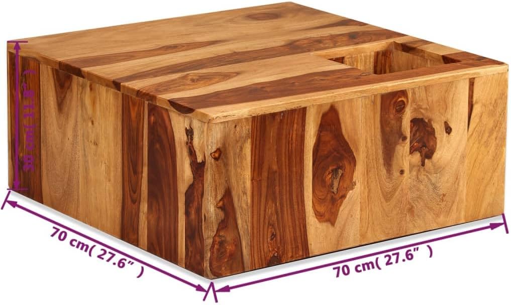 This striking wooden coffee table exudes a rugged charm that will make it a distinctive addition to your living room or bedroom. It can also be used as a side table.The table is made of solid Sheesham wood. Sheesham, also known as a rosewood or palisander, is a tropical hardwood famous for its rich grains. The beautiful wood grains make every piece of furniture unique and slightly different from the next. The coffee table is fully handmade and each step of the process is carried out with the greatest care, be it polishing, painting or lacquering. The smooth tabletop has a square recess for storing bottles or anything else you'd like to keep within reach.Important note: The colors vary from piece to piece, making each coffee table unique; the delivery is random.Material: Sheesham woodDimensions: 27.6" x 27.6" x 11.8" (L x W x H)Polished, painted and lacqueredWith a square, recessed storage area